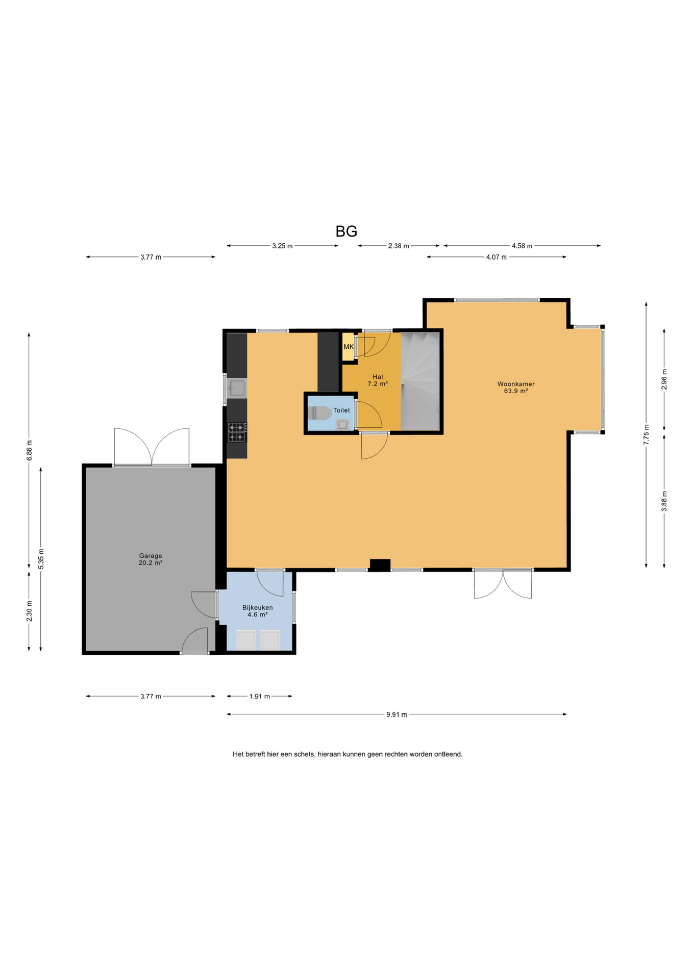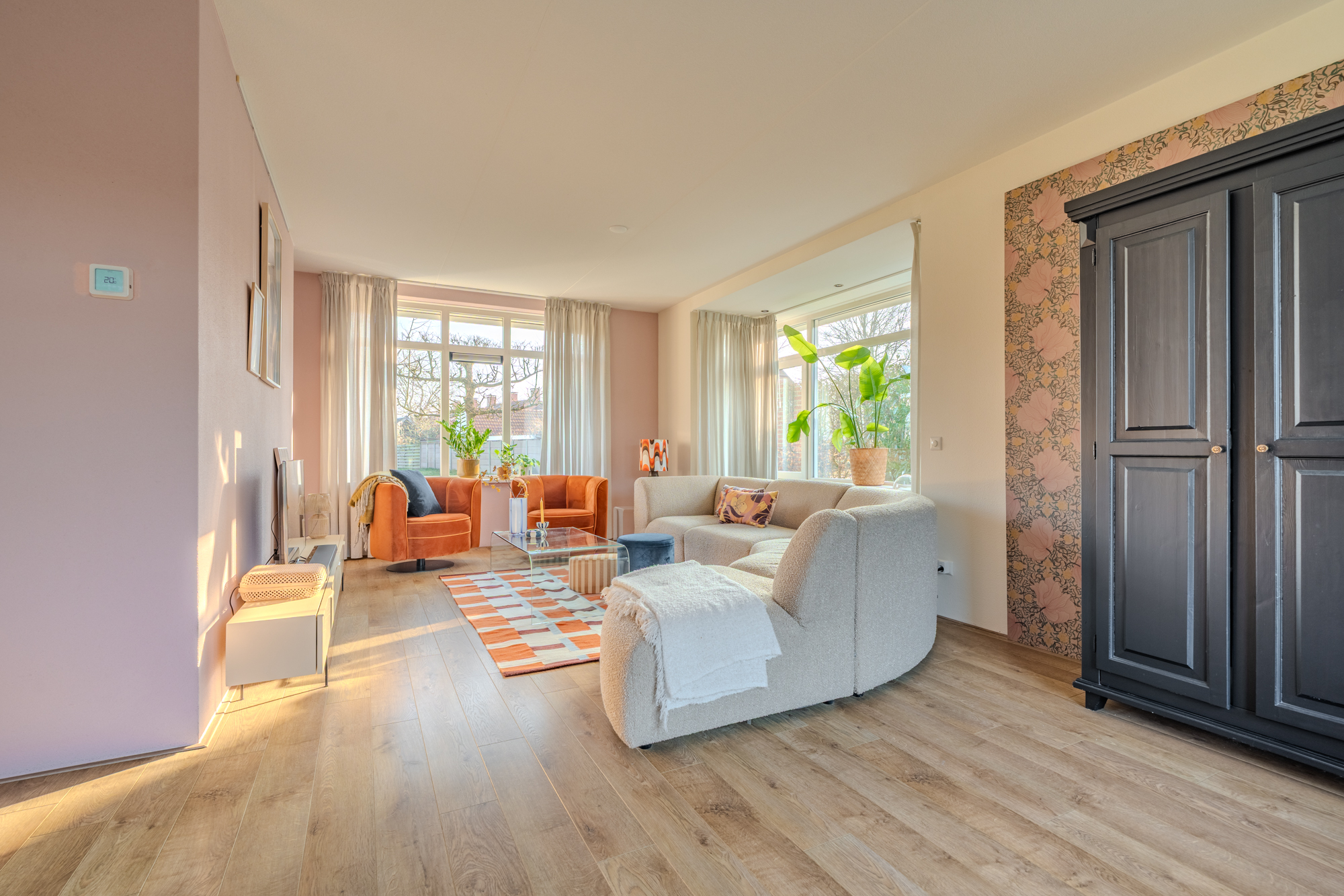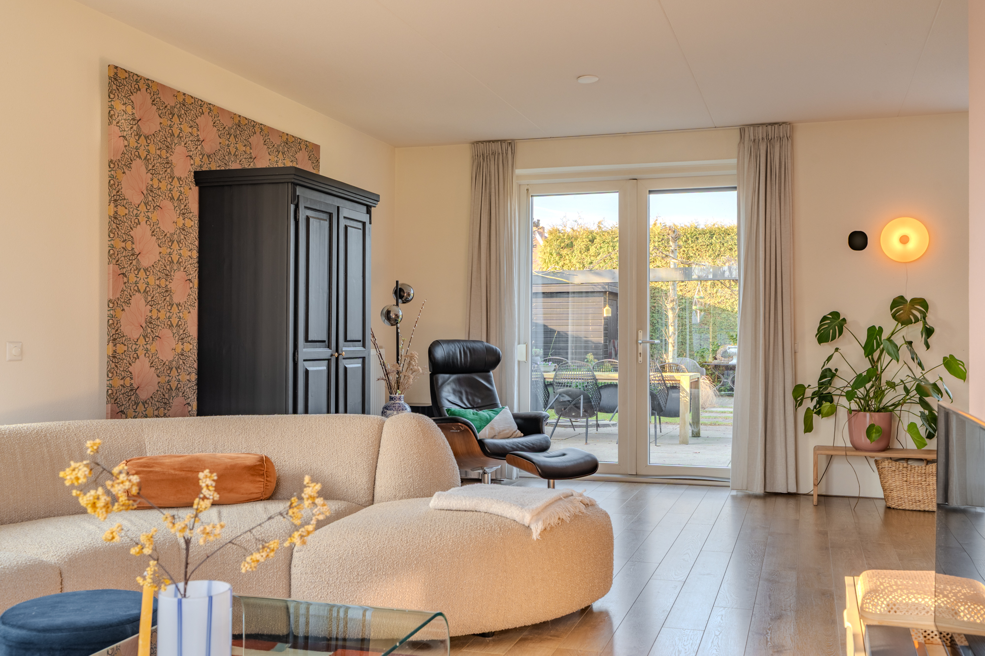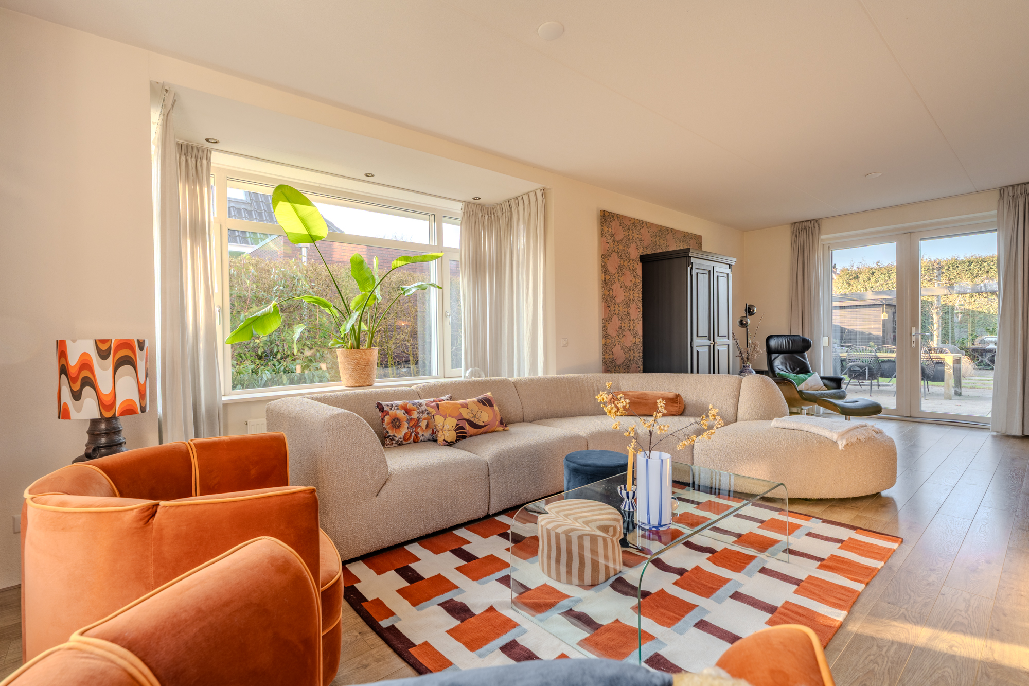Begane grond: hal / entree met meterkast en trapopgang; toiletruimte met wandcloset en fonteintje; zeer ruime U-vormige living met erker, openslaande tuindeuren en open keuken (in totaal ca. 64m²) v.v. een moderne inbouwkeuken met diverse apparatuur (o.a. 5-pits gaskookplaat, afzuigkap, vaatwasser, koeler, hete lucht oven en magnetron); bijkeuken met witgoedaansluitingen en doorgang naar de aangebouwde garage (ca. 20m²) met vaste kastenwand en achter-entree.