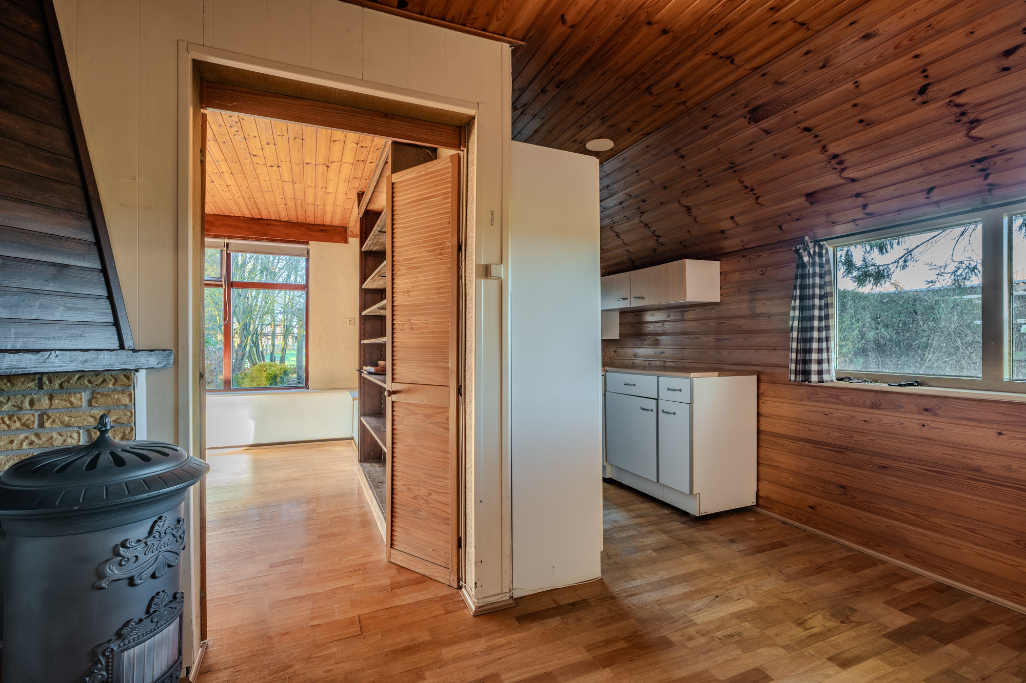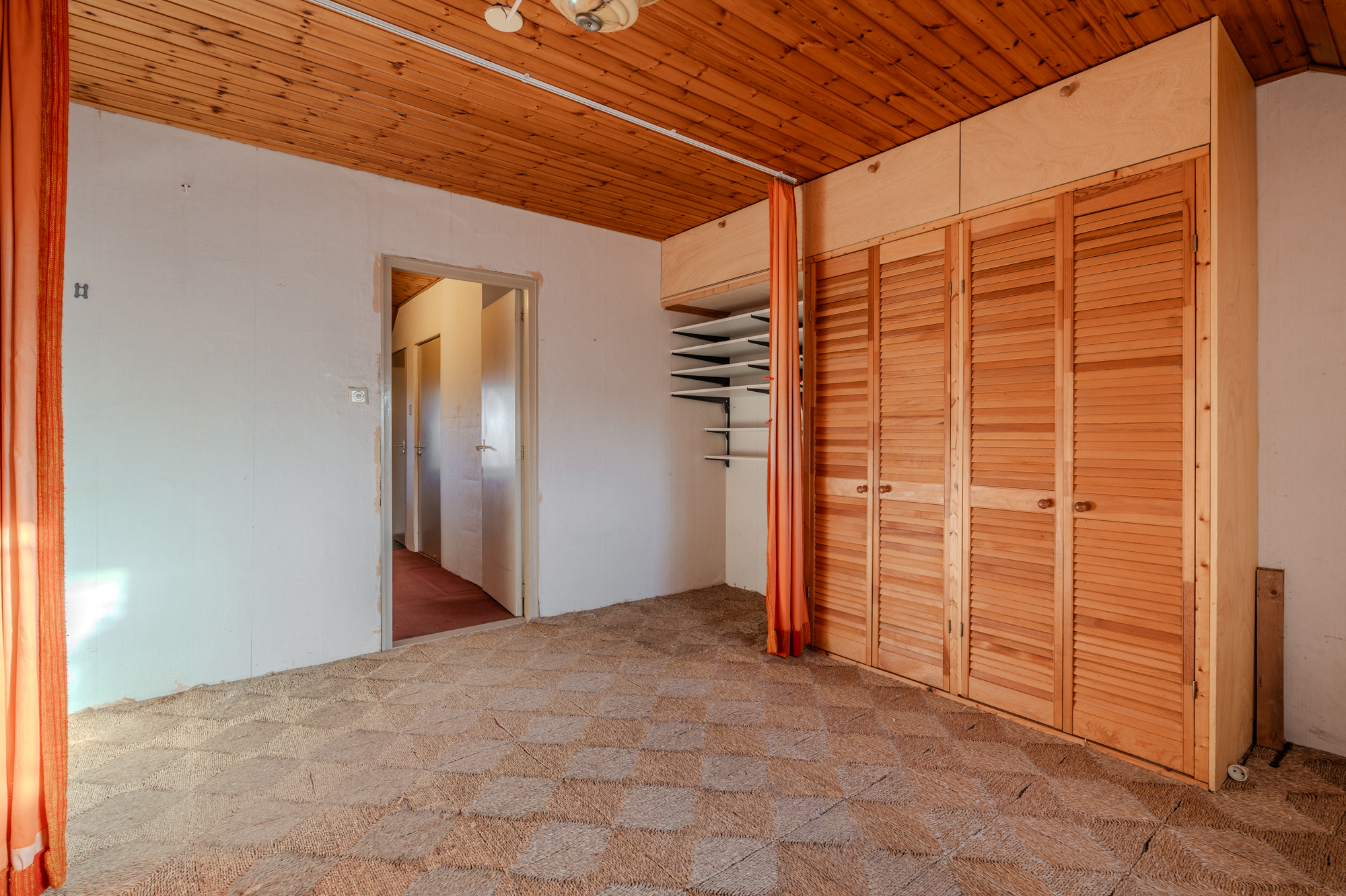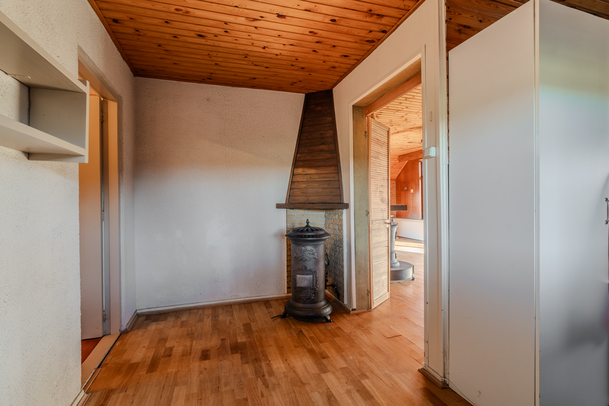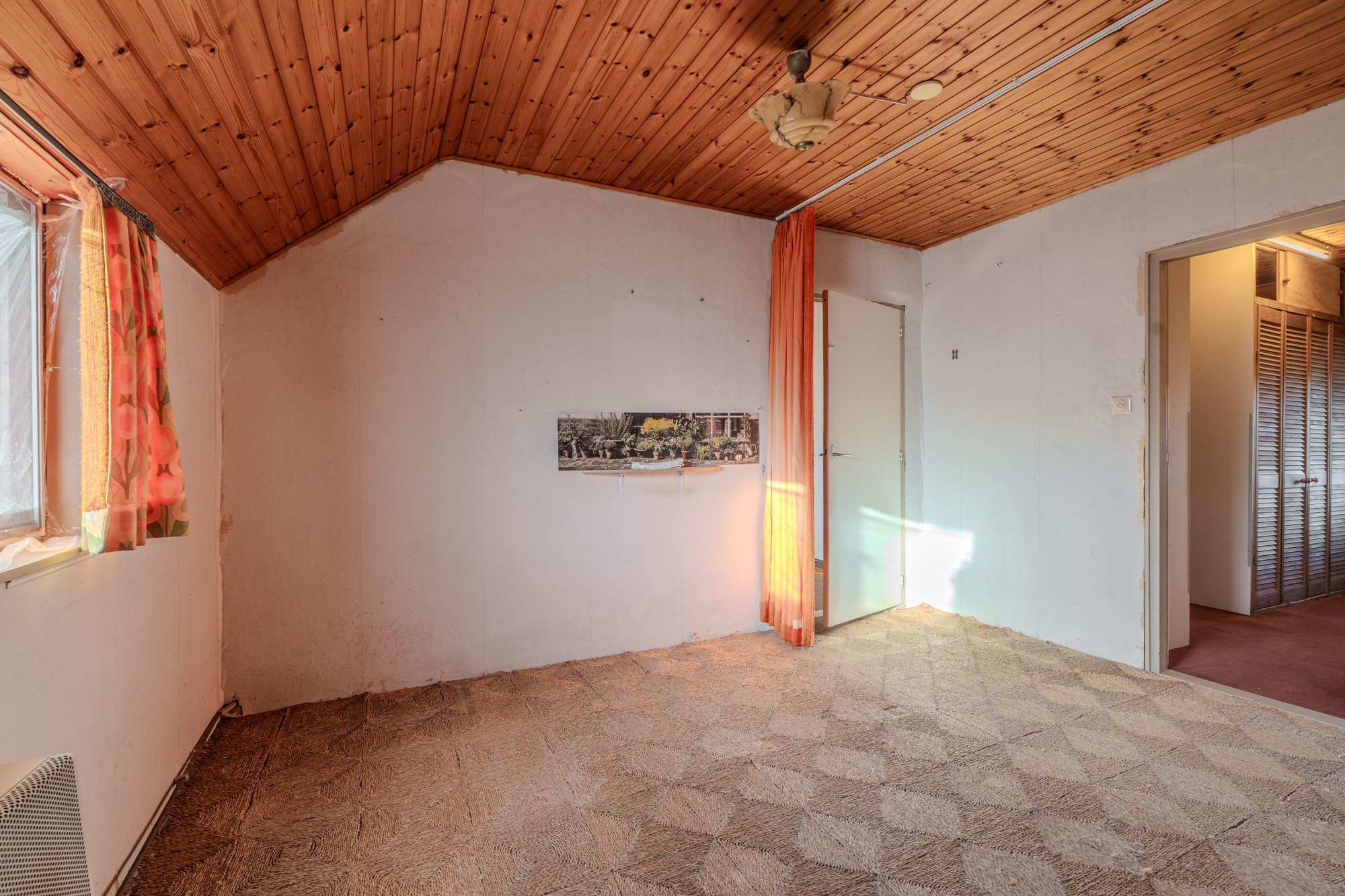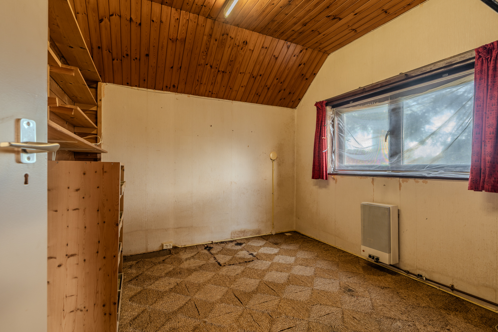 Indeling: centrale hal met zij-entree en meterkast; toiletruimte; doucheruimte met wastafel; keuken (ca. 13m²) met een eenvoudig keukenblok; woonkamer (ca. 22.8m²); slaapkamer (ca. 13.8m²) met vaste inbouwkasten en een doorgang naar een 2e slaapkamer (ca. 8.5m²); 3e slaapkamer (ca. 8.8m²); bijkeuken (ca. 10.3m²) met achter-entree en vlizotrap naar een ruime bergzolder.