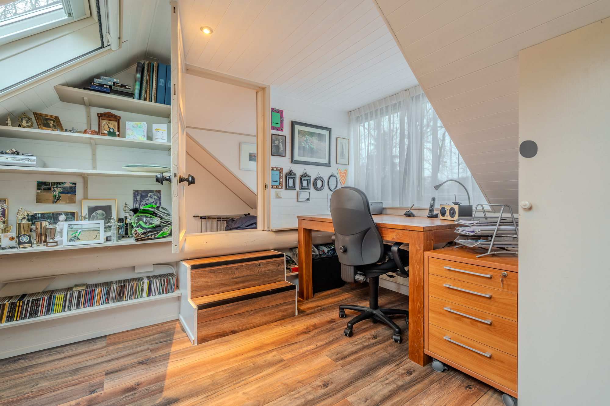 Verdieping: overloop; 2 slaapkamers (ca. 6.8m² en 7.2m²) waarvan één met een dakkapel en doorgang naar een bergzolder met CV-opstelling.
