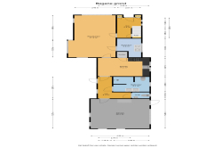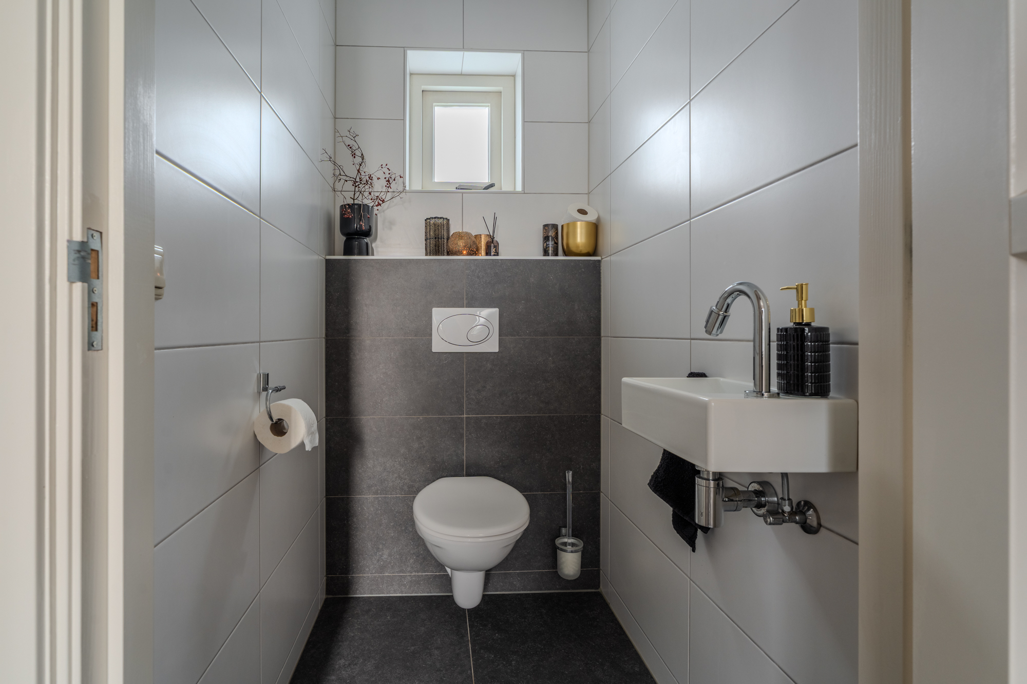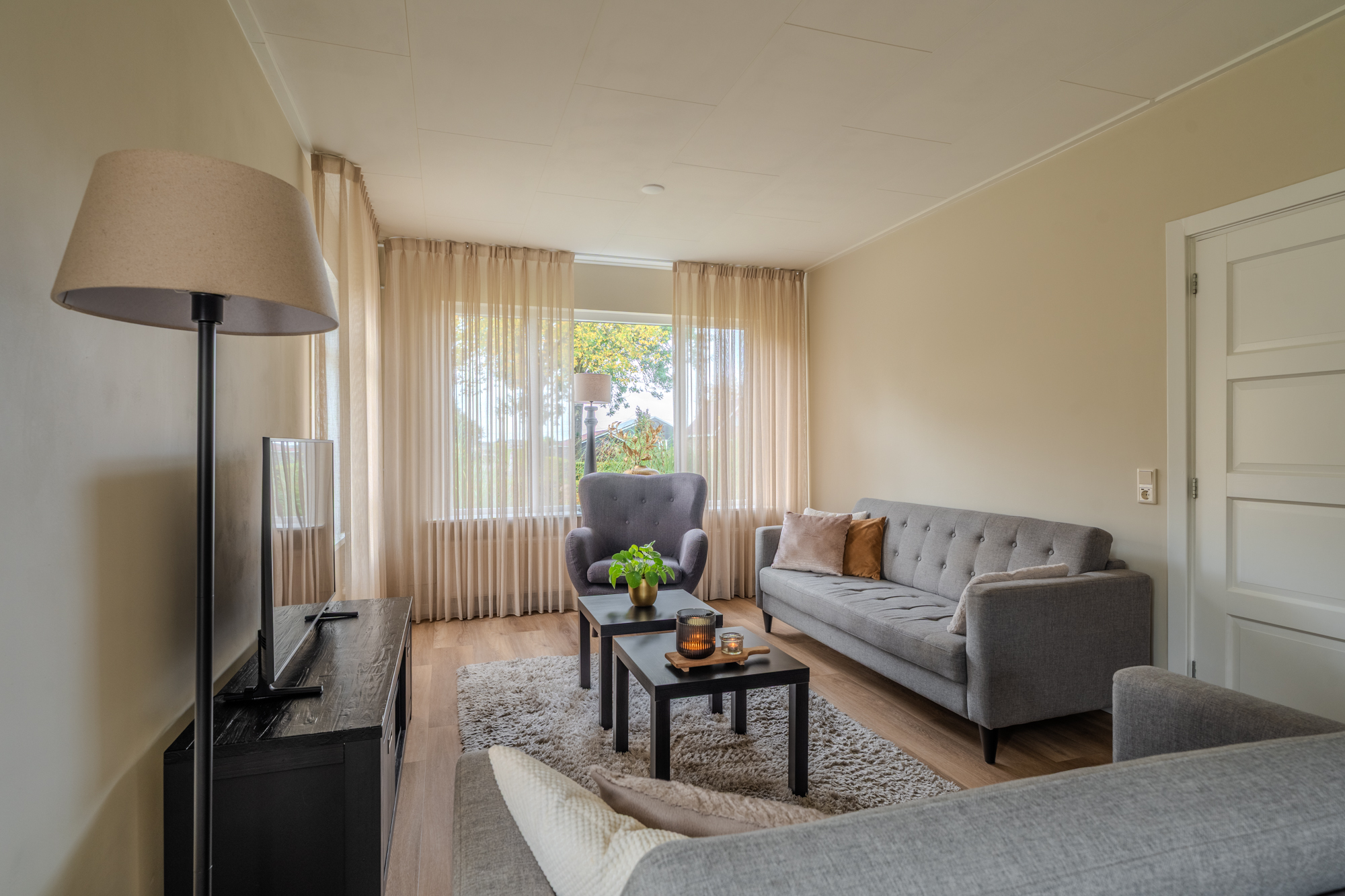 Begane grond; hal-/entree met trapopgang naar de 1e verdieping en meterkast; lichte en sfeervolle woonkamer (ca. 28m²); woonkeuken (ca. 14.3m²) met toegang naar de kelder (ca. 6.9m²) en v.v. een moderne L-vormige inbouwkeukenblok met diverse apparatuur (o.a. 5-pitsgaskookplaat, vaatwasser, koelkast, combi-oven-/magnetron en afzuigkap); bijkeuken met witgoedaansluitingen en CV-opstelling; achterhal met zij-entree; toiletruimte met wandcloset en fonteintje; moderne badkamer v.v. inloopdouche, badmeubel met dubbele wastafel en 2e toilet; doorgang naar de inpandige garage (ca. 26.2m²), deze is voorzien van een loopdeur, elektrisch bedienbare sectionale garagedeur en een bergzolder (ca. 13.8m²).