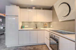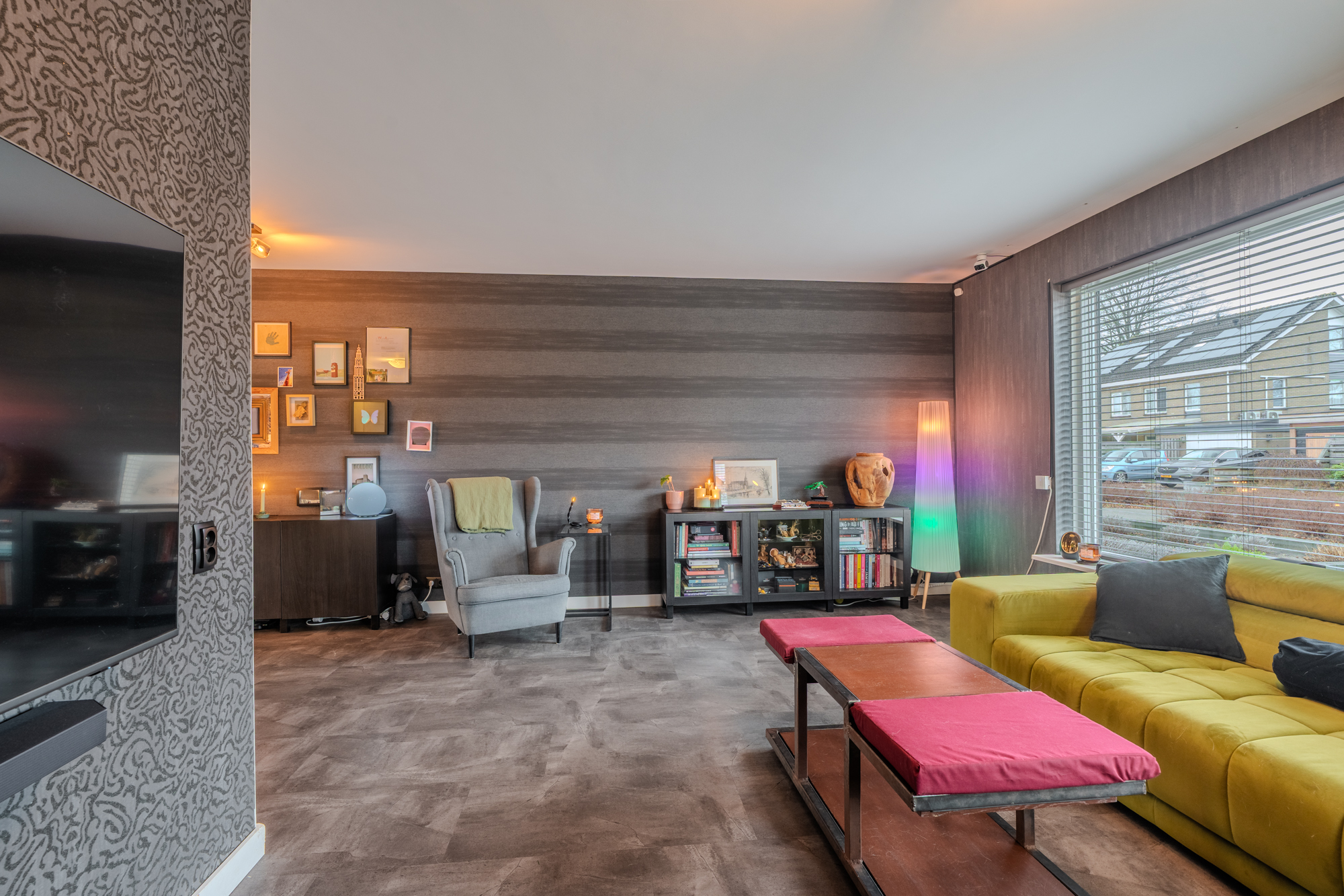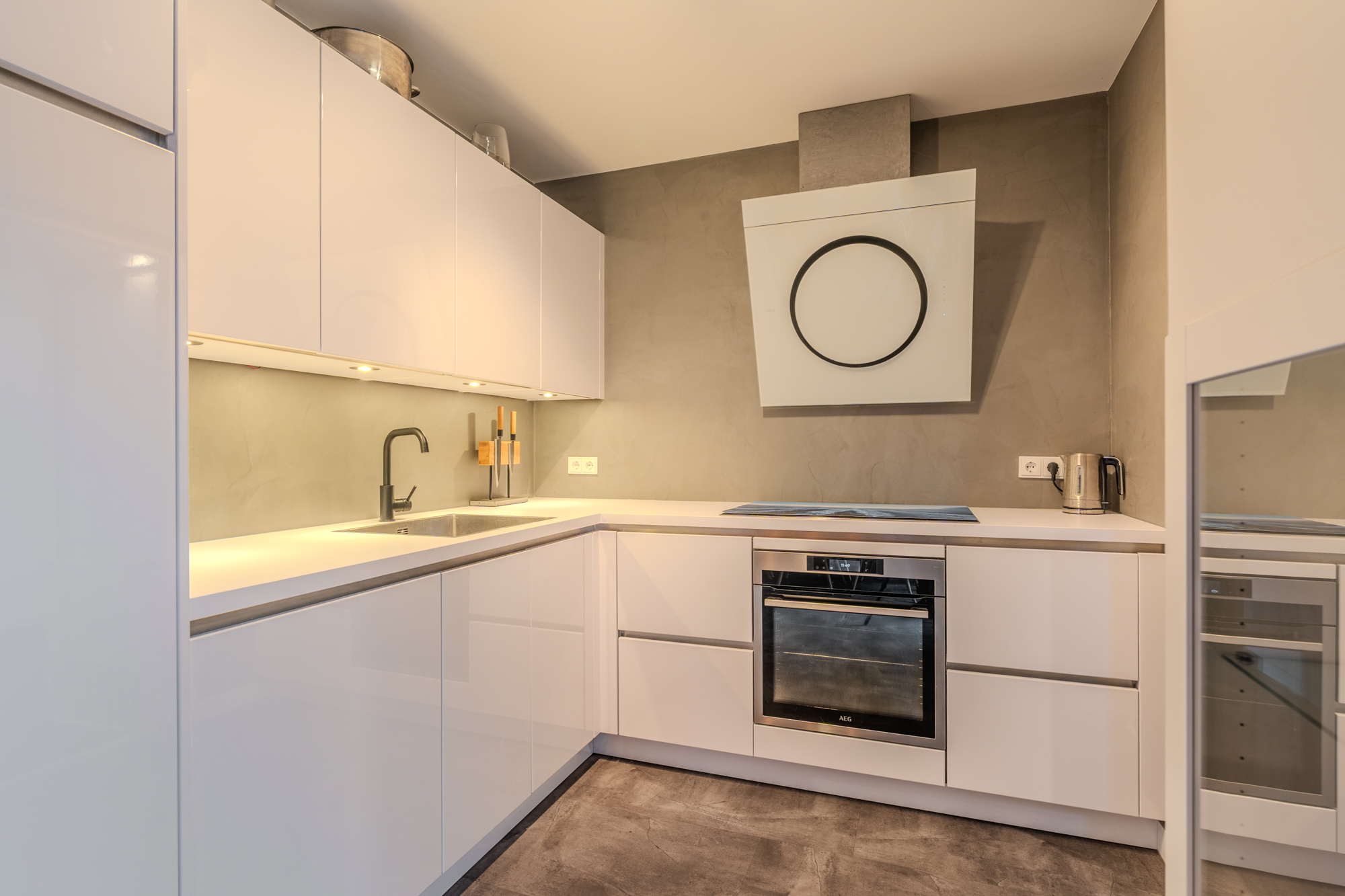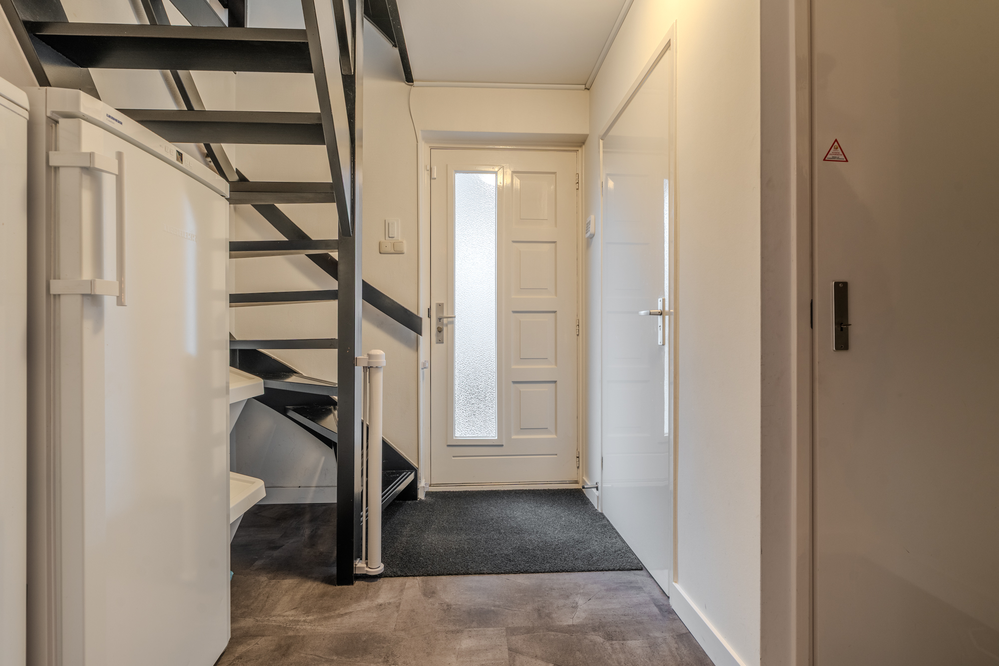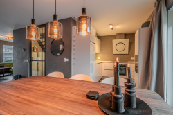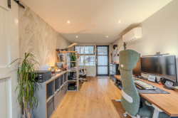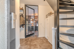 Indeling: hal-/entree met meterkast en trapopgang; toiletruimte met modern wandcloset; ruime woonkamer; moderne open keuken v.v. diverse inbouwapparatuur (inductie kookplaat, afzuiging, oven, koelkast en vaatwasser); bijkeuken met achter-entree, installatiewerk en riante inbouwkast met witgoedaansluitingen; werk- of slaapkamer v.v. airco-unit.