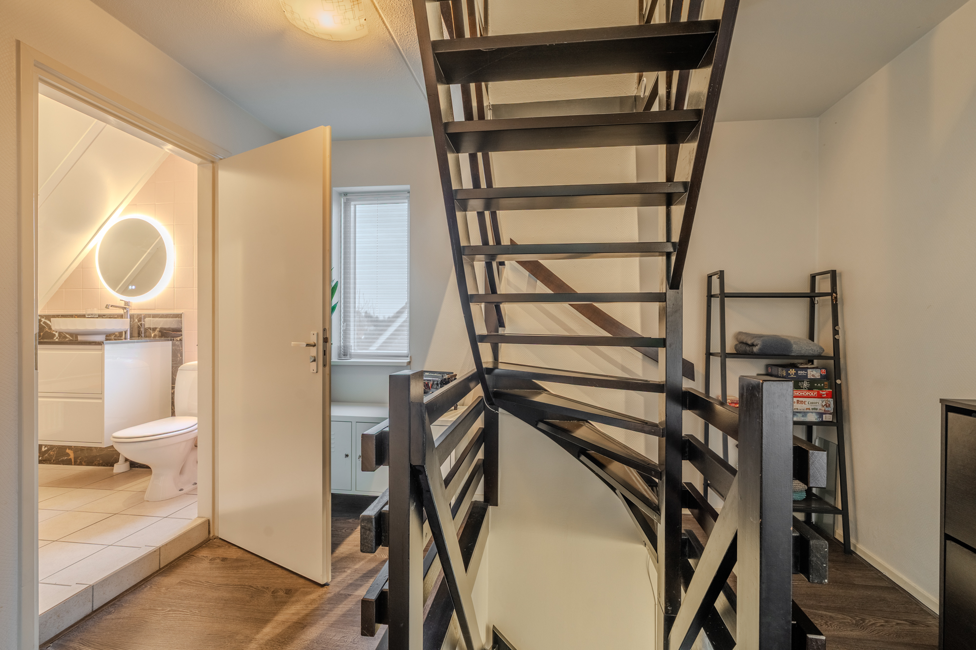 2e verdieping: overloop met inbouwkasten; slaapkamer, eveneens met vaste kastruimte.