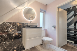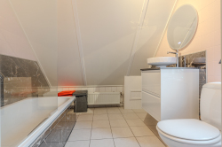 1e verdieping: overloop; twee slaapkamers, waarvan één met airco-unit; nette badkamer met ligbad, douche, toilet en wastafelmeubel.