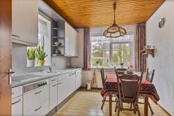 Indeling: hal met zij-entree, meterkast en trapopgang; kelder; toiletruimte; L-vormige woonkamer (ca. 34m²); woonkeuken (ca. 12m²) v.v. inbouwkeuken met enige apparatuur; bijkeuken met witgoedaansluitingen; garage-/berging.