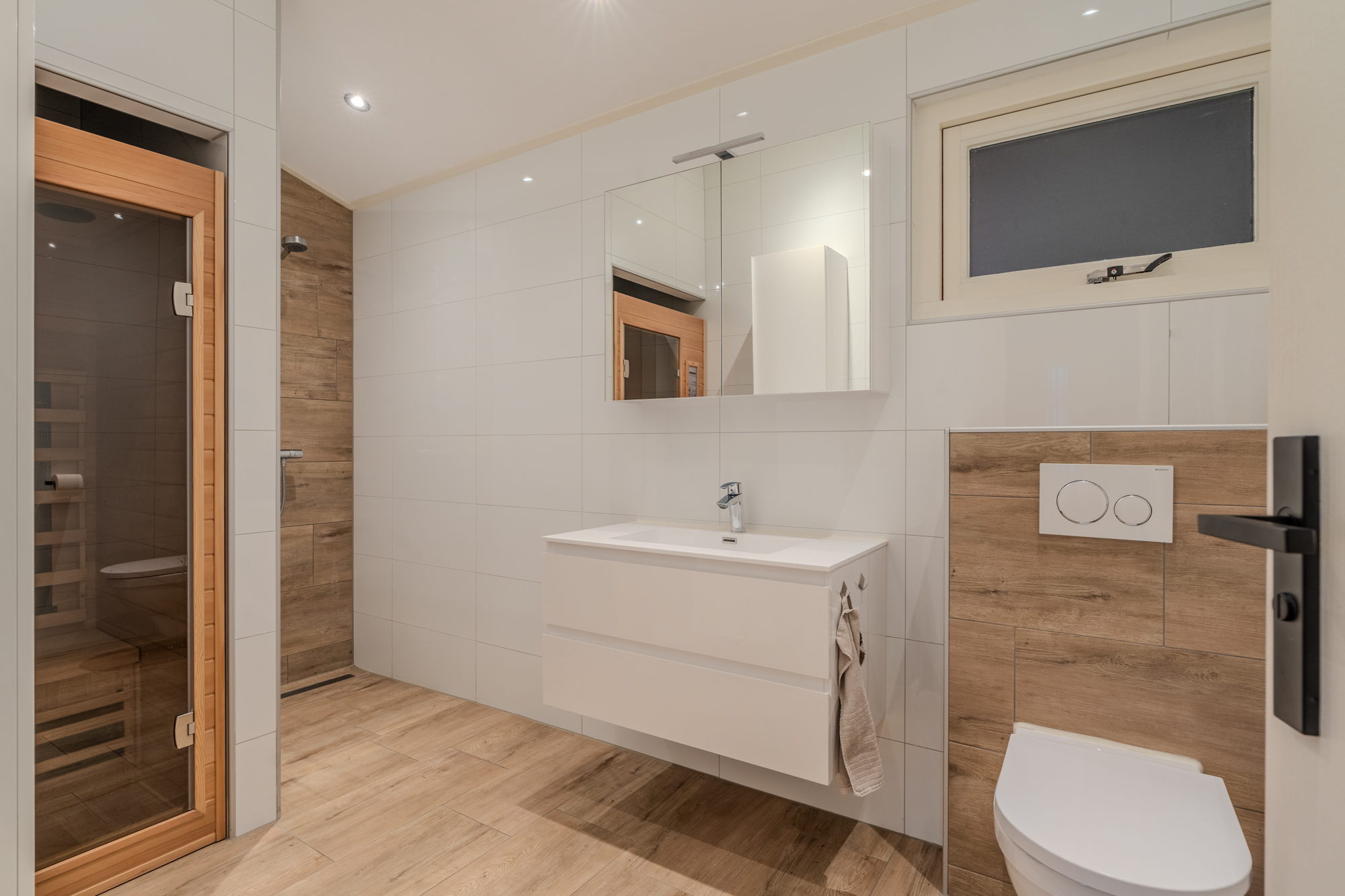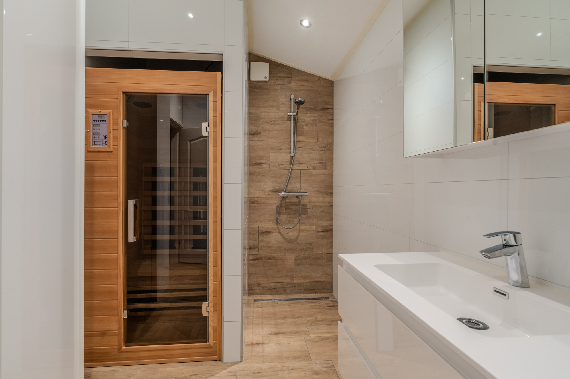 Indeling: hal / entree met meterkast; toiletruimte met wandcloset en fonteintje; woonkamer (ca. 43.5m²) met airco-unit, openslaande tuindeuren aan de achterzijde en een praktische trapkast; keuken v.v. moderne inbouwkeuken in hoekopstelling (vernieuwd in 2018) met diverse apparatuur (o.a. inductiekookplaat met geintergreerde afzuiging, vaatwasser, koelkast, vriezer en combi-magnetron-/oven); ruime bijkeuken met witgoedaansluitingen en achter-entree; slaapkamer (ca. 11.8m²) met aansluitend een luxe badkamer v.v. douchehoek, wastafel, 2e toilet (wandcloset) en een sauna; aangebouwde (van buitenaf) bereikbare schuurruimte (ca. 12.2m²).