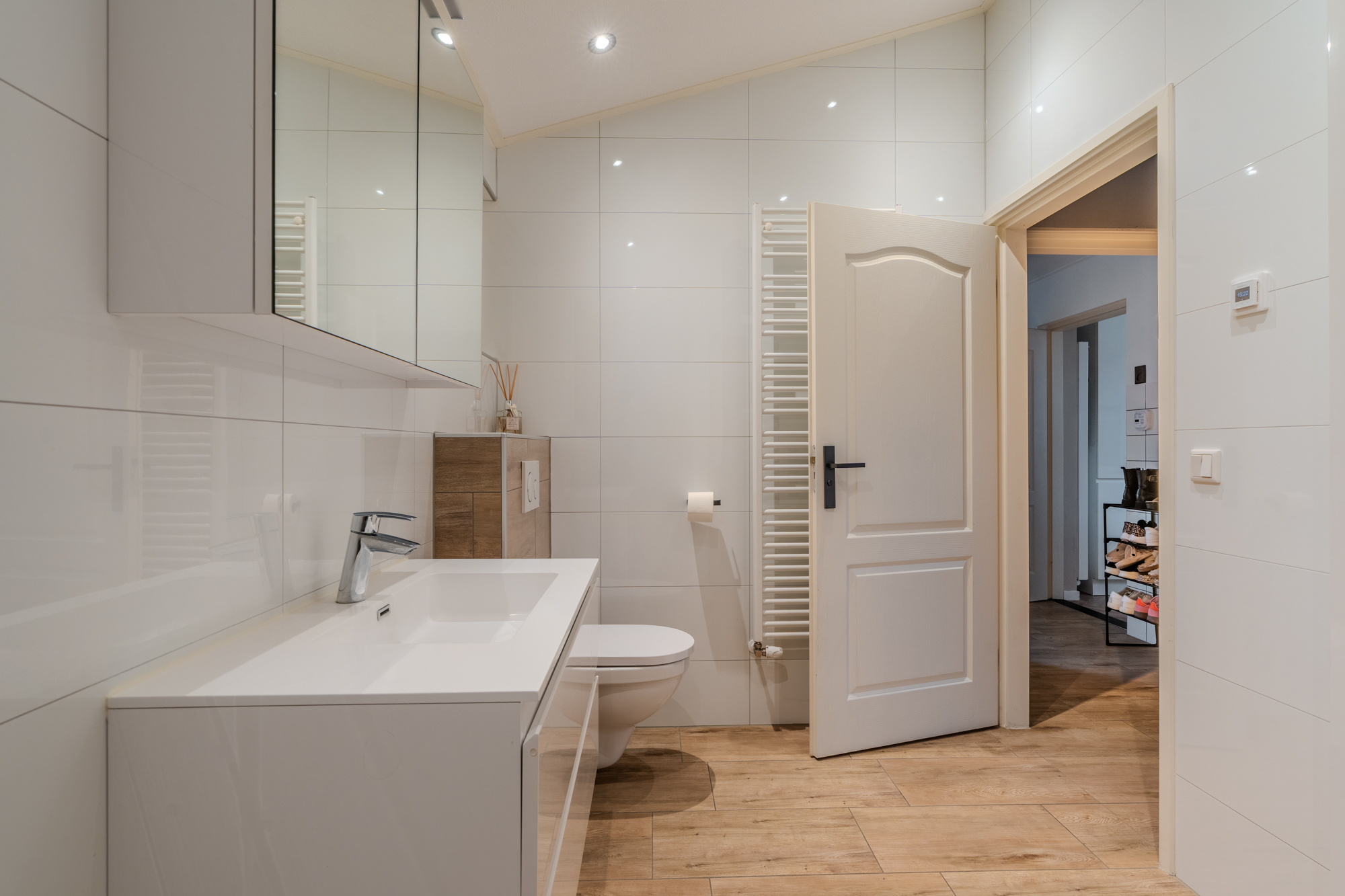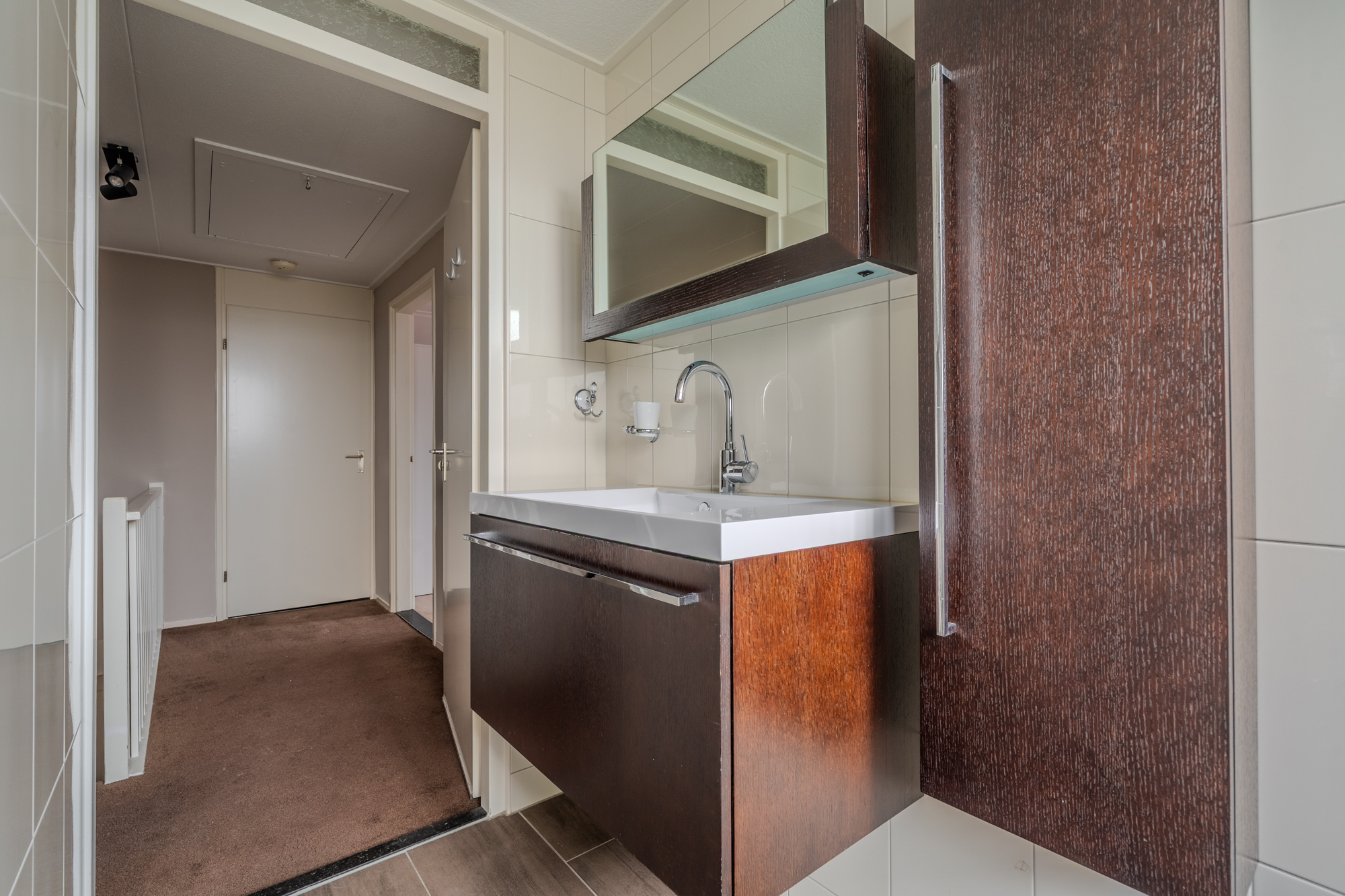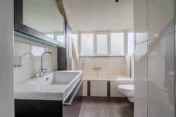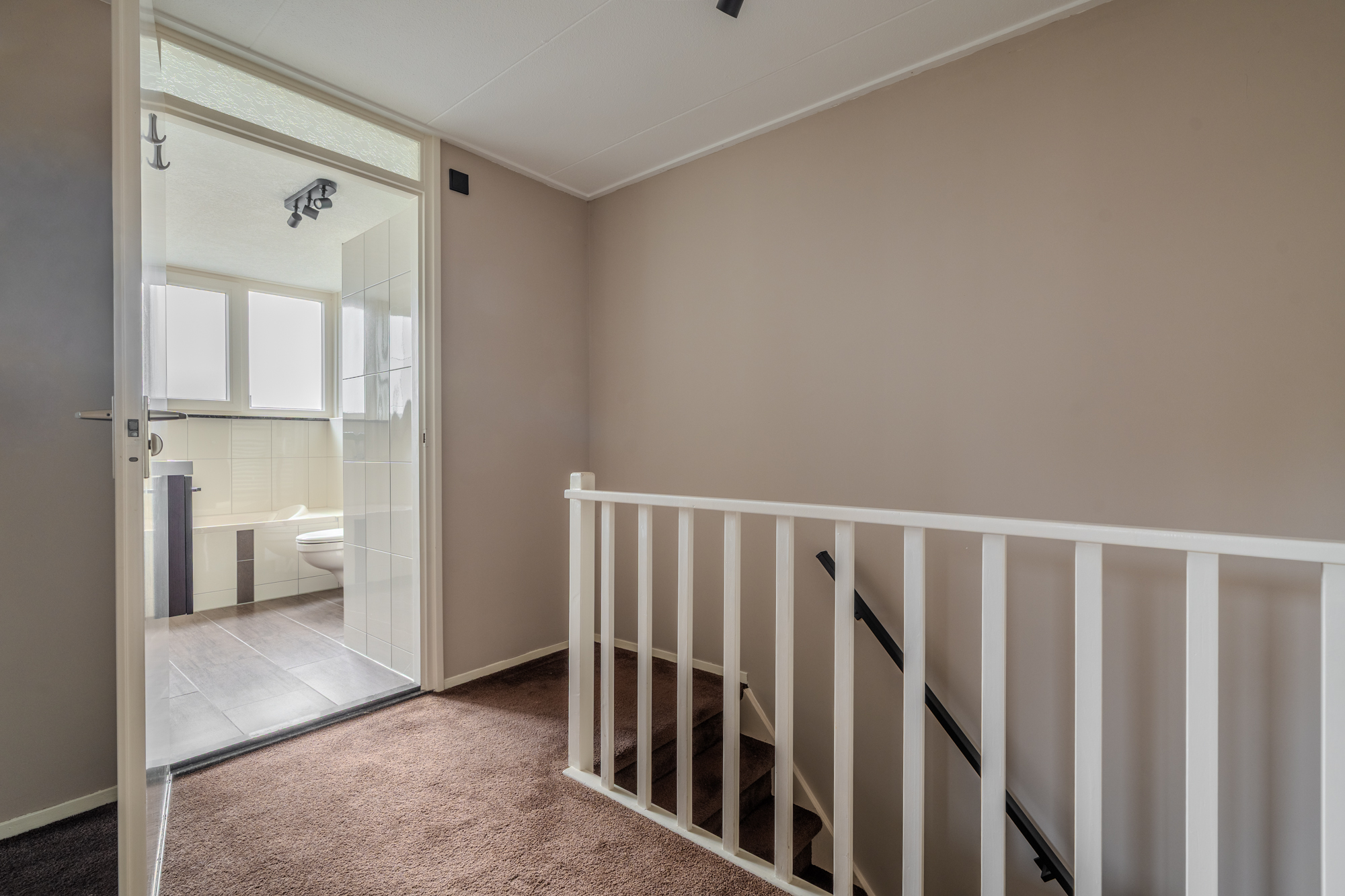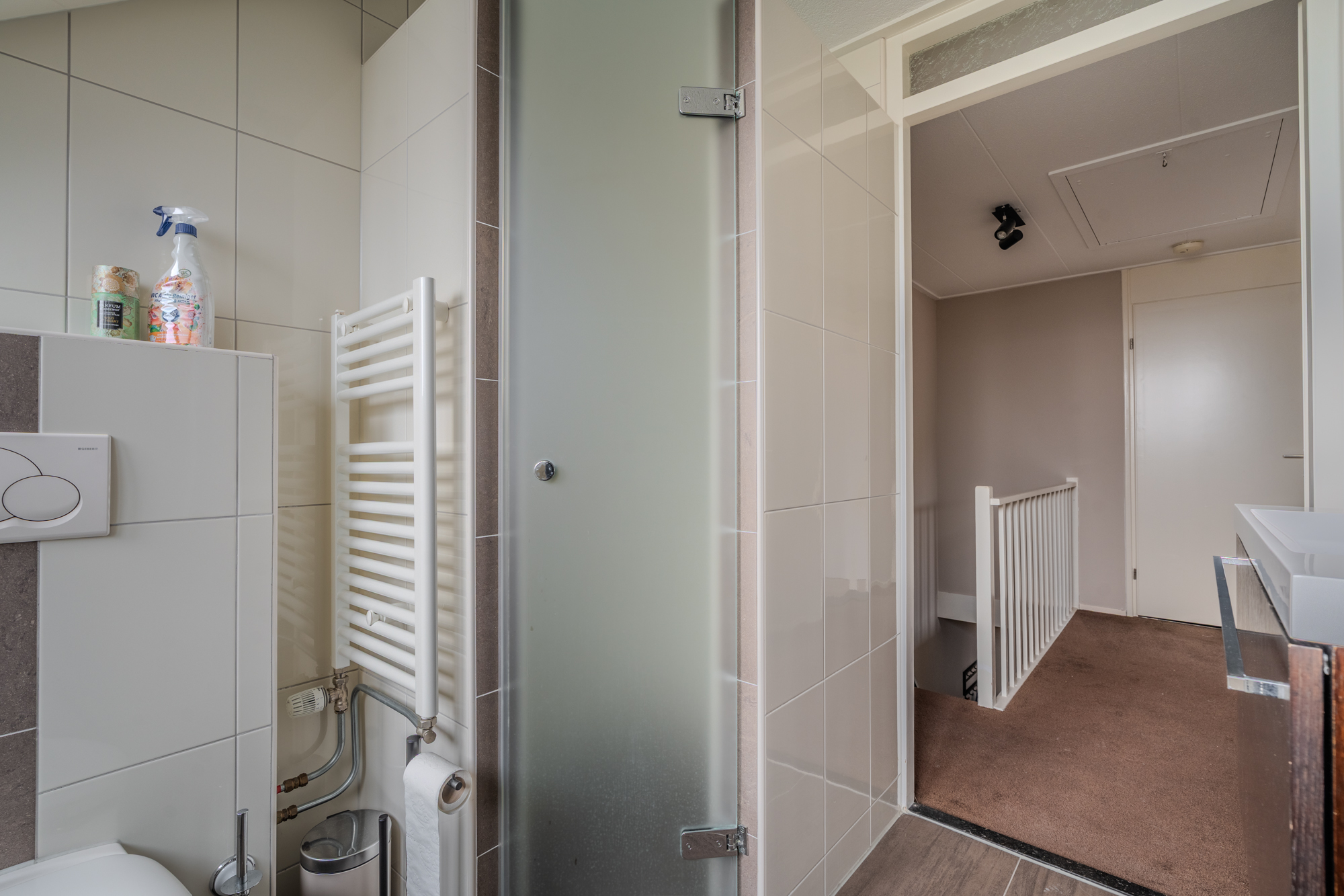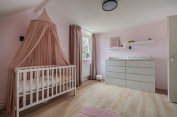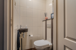 Verdieping: overloop; 2 ruime slaapkamers (ca. 11.2m² en 12.9m²); 2e badkamer met douchehoek, ligbad, vaste wastafel en 3e toilet (wandcloset); berging met CV-opstelling een Ferroli warmtepompboiler voor warm water.