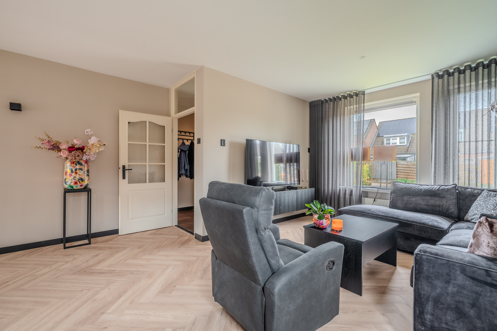 - nagenoeg geheel v.v. kunststof kozijnen met HR++ glas en screens.