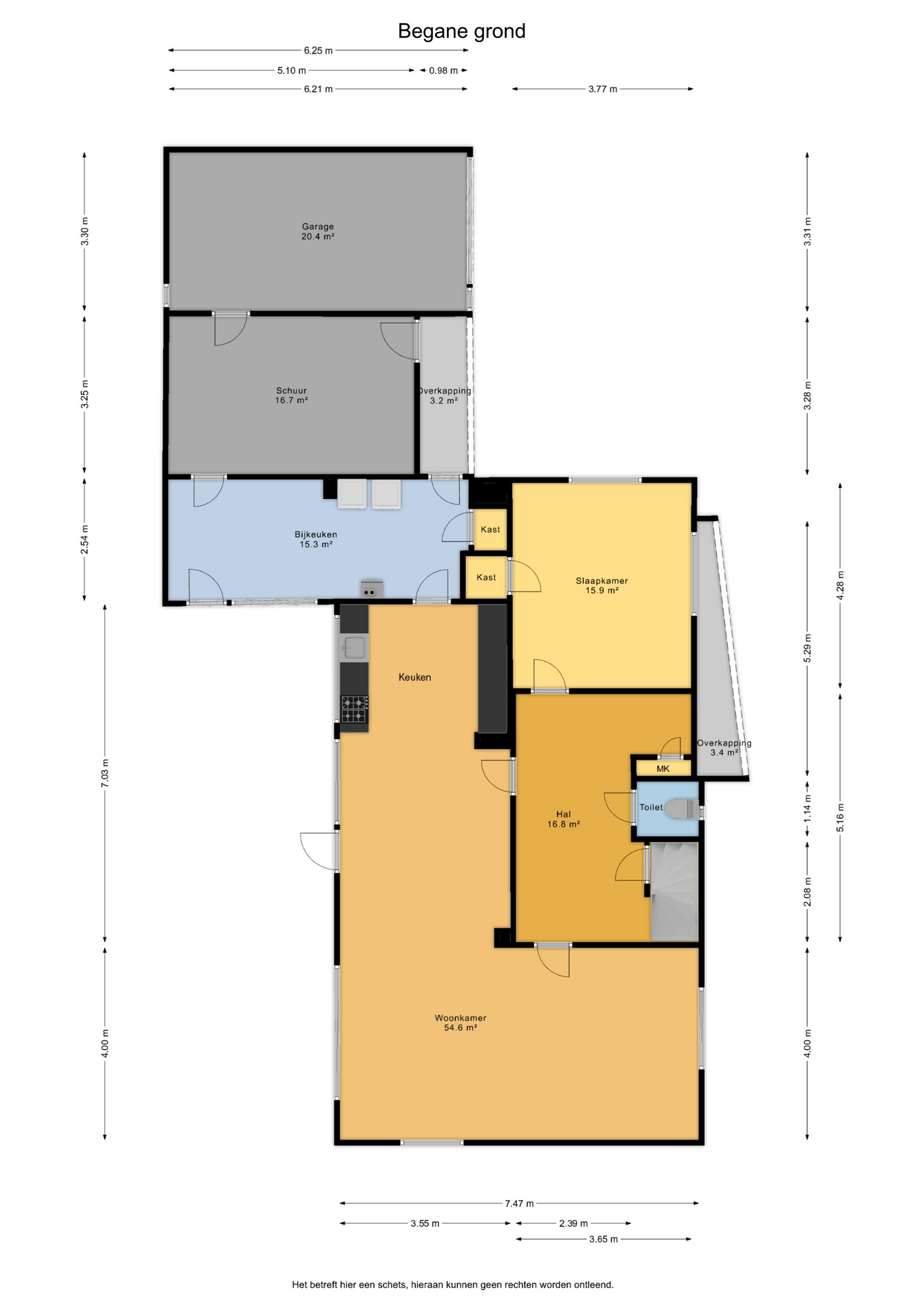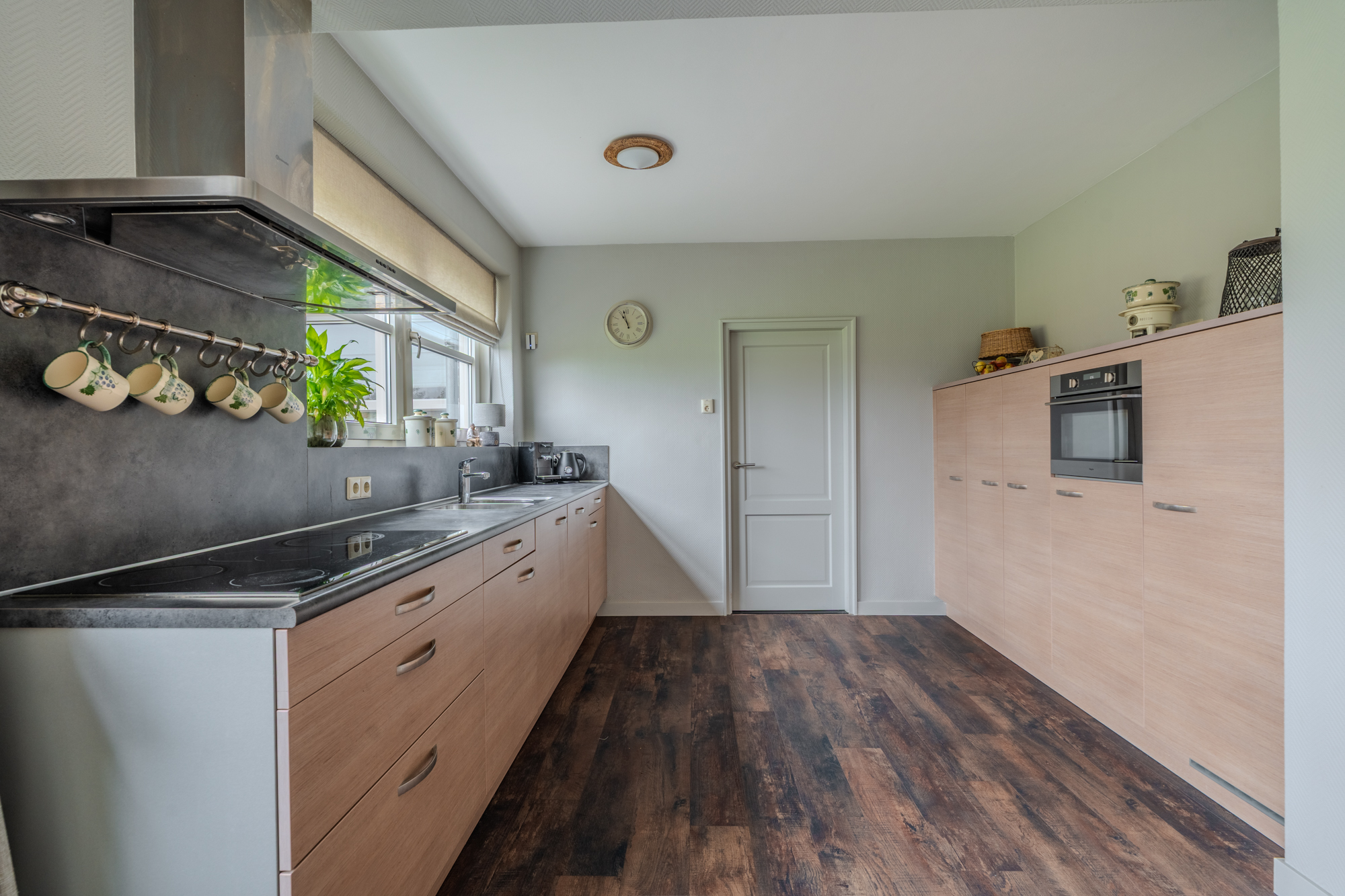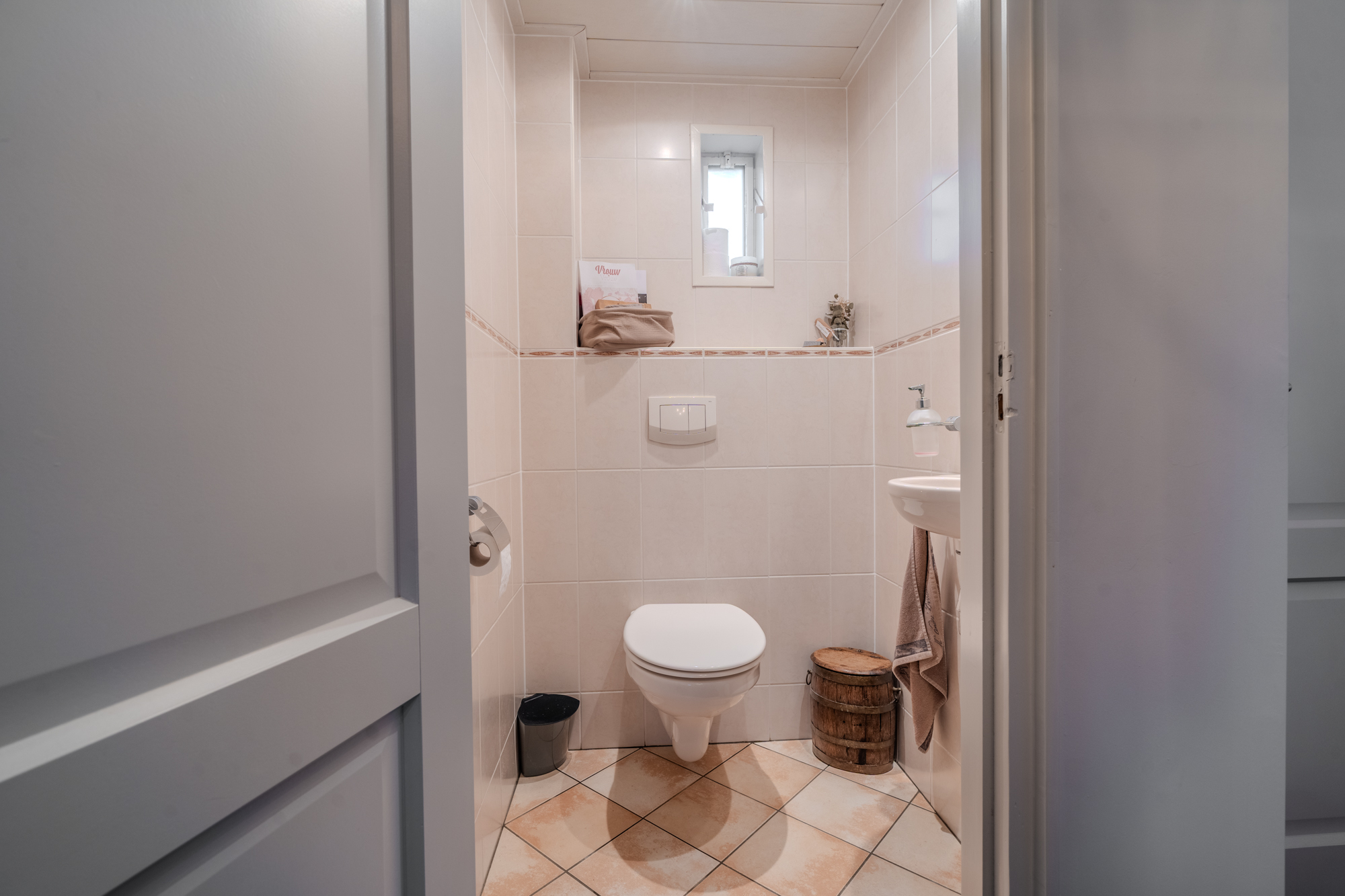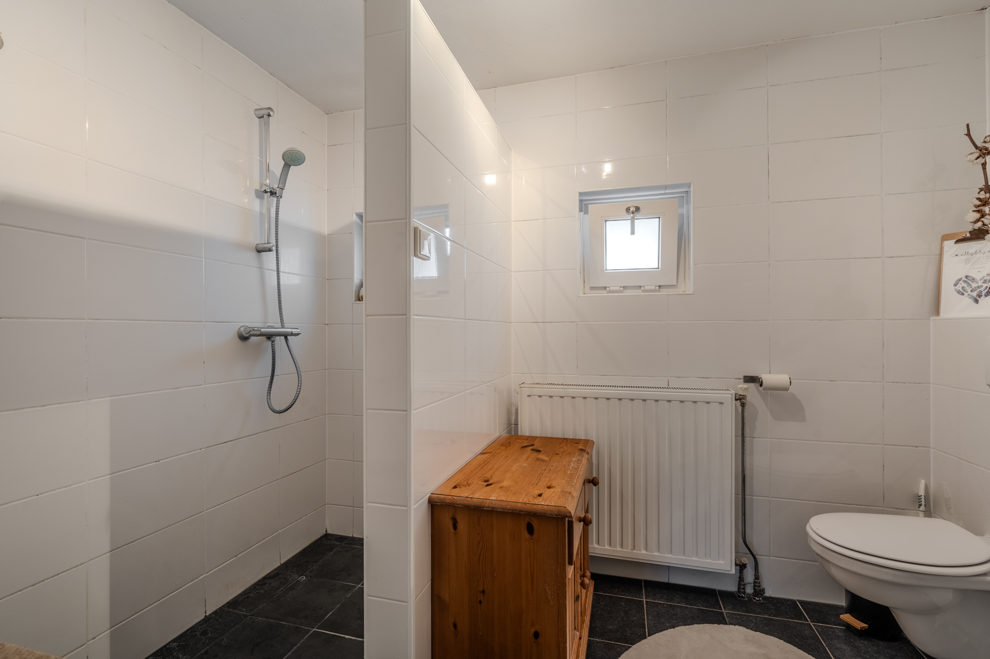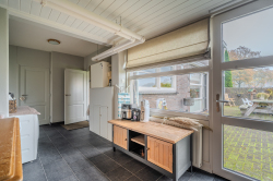 Begane grond: centrale hal-/entree met meterkast en trapopgang; provisiekelder; toiletruimte met wandcloset en fonteintje; slaapkamer (ca. 15.9m²) met vaste kast; zeer ruime L-vormige woonkamer met open keuken (in totaal ca. 54.6m²) met openslaande tuindeur en inbouwkeuken met diverse apparatuur (o.a. kookplaat, afzuigkap, oven, koeler en vaatwasser); grote bijkeuken met witgoedaansluitingen, achter-entree en doorgang naar de aangebouwde schuurruimte (ca. 16.7m²) en garage (ca. 20.4m²) met elektrisch bedienbare sectionaaldeur.