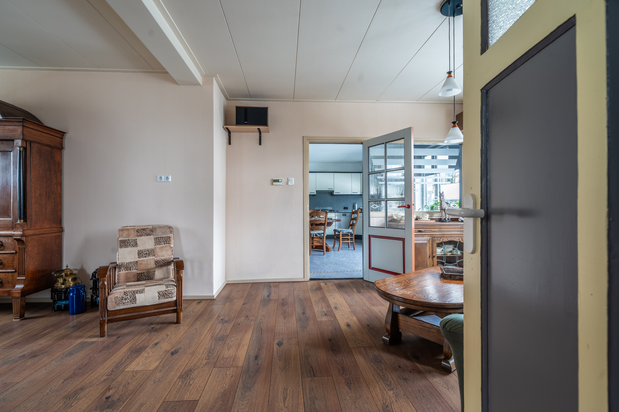 Indeling: ruime hal / entree (ca. 11.7m²) met meterkast; slaap-/werkkamer (ca. 12.8m²); woonkamer (ca. 29.6m²); woonkeuken (ca. 26.3m²) v.v. inbouwkeuken in hoekopstelling met enige apparatuur (o.a. 5-pits gaskookplaat, afzuigkap, vaatwasser en combi-magnetron) en provisie(trap)kast; bijkeuken-/gang (ca. 10m²) met achter-entree, witgoedaansluitingen en trapopgang; toiletruimte met wandcloset en fonteintje; badkamer met douchehoek, wastafel(meubel) en ligbad.