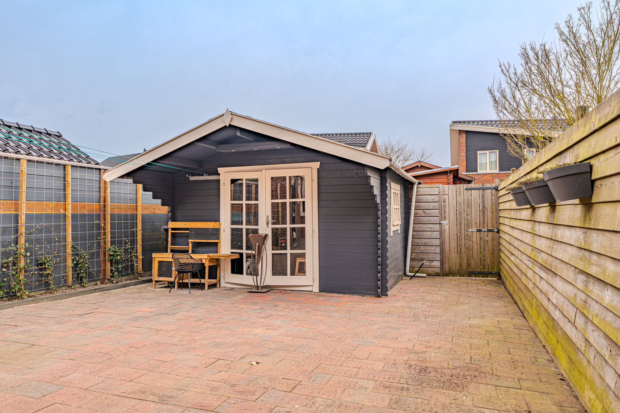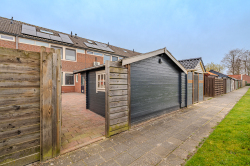 - De vrijstaande houten schuur (ca. 10m²) is 2.75m x 3.5m groot en heeft aan de voorzijde een overkapping.