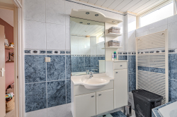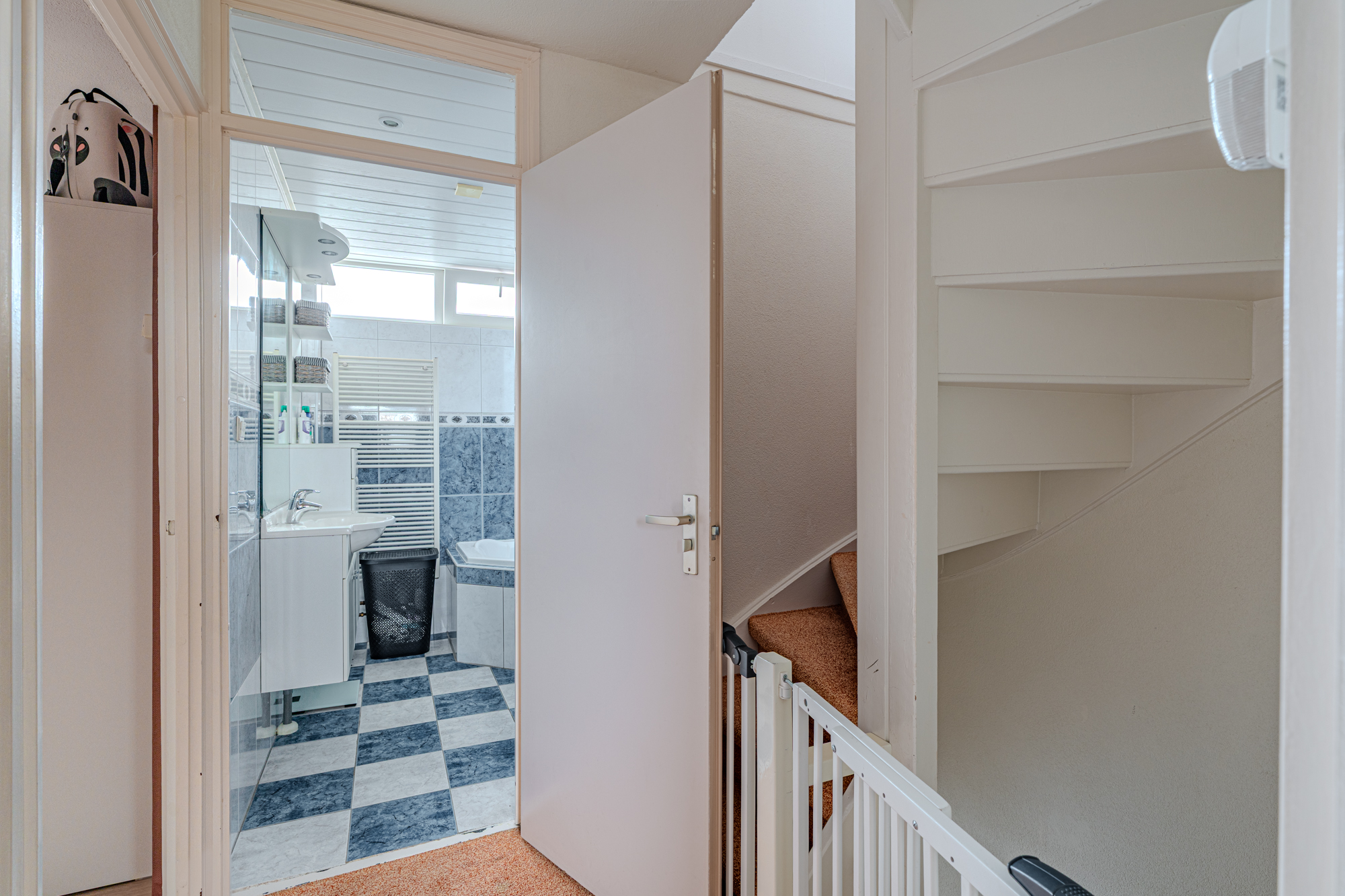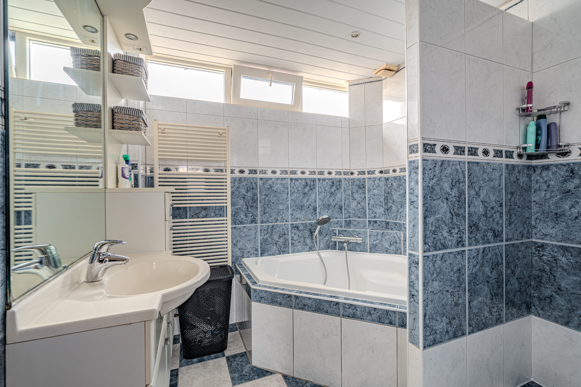 Verdieping: overloop; 3 slaapkamers (ca. 14.2m², 12.3m² en 6.7m²); ruime badkamer met douchehoek, ligbad en badmeubel met wastafel.