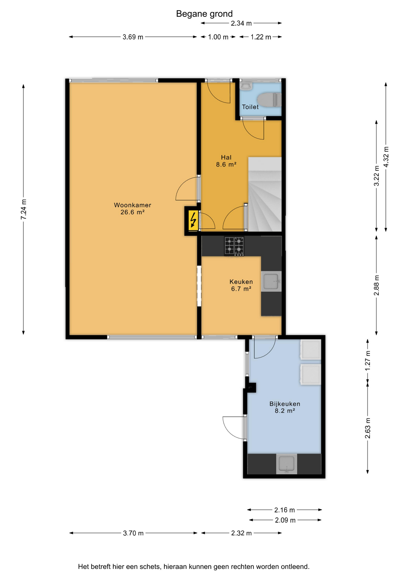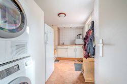 Indeling: hal / entree met trapopgang, meterkast en provisieruimte; toiletruimte met wandcloset en fontein; woonkamer (ca. 26.6m²) met laminaatvloer en doorgang naar de keuken (ca. 6.7m²) v.v. een inbouwkeuken in hoekopstelling met diverse apparatuur (o.a. combi-magnetron, vaatwasser, koelkast, afzuigkap en gaskookplaat); bijkeuken met 2e keukenblokje v.v. spoelbak, witgoedaansluitingen en achter-entree.