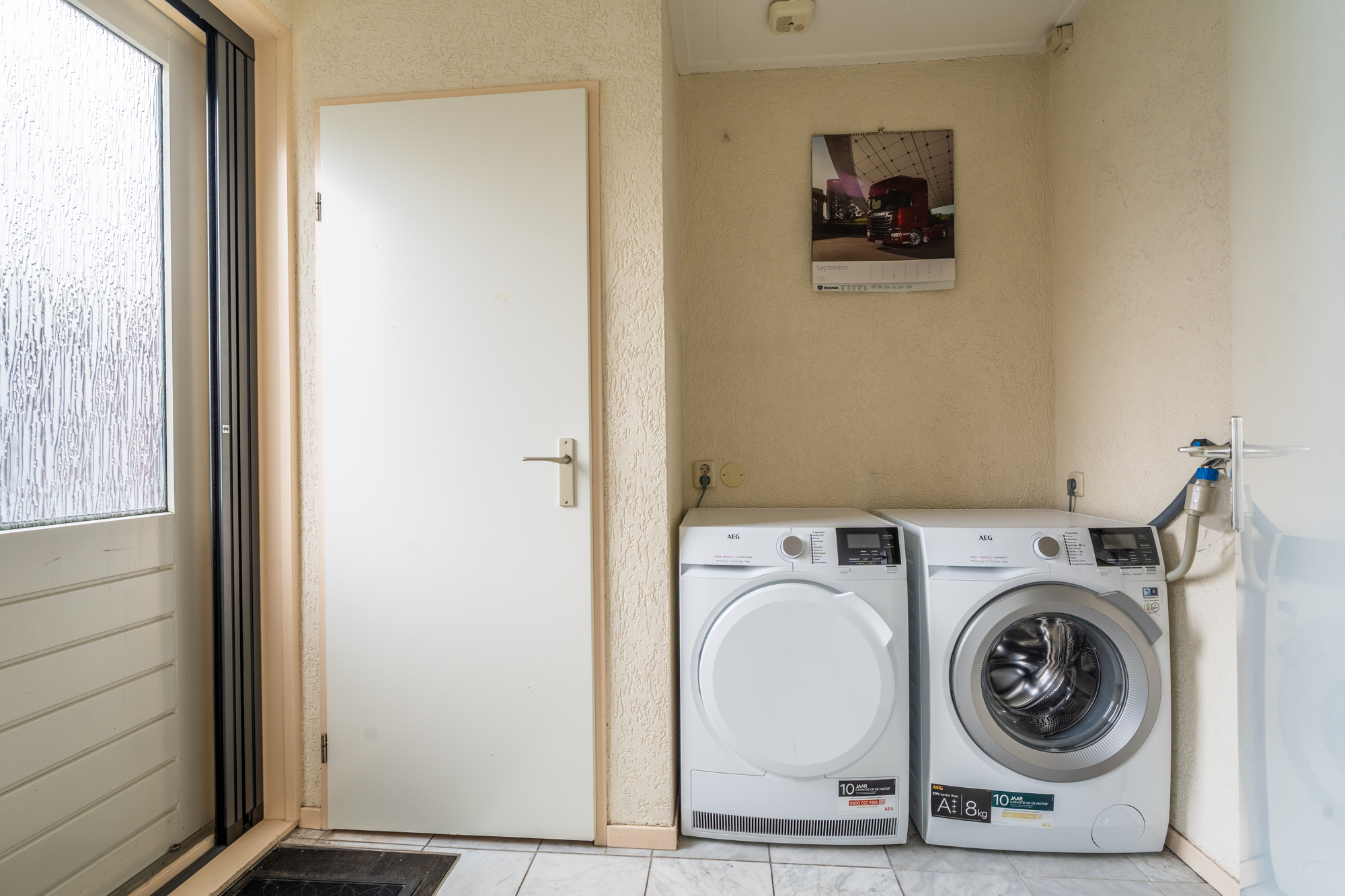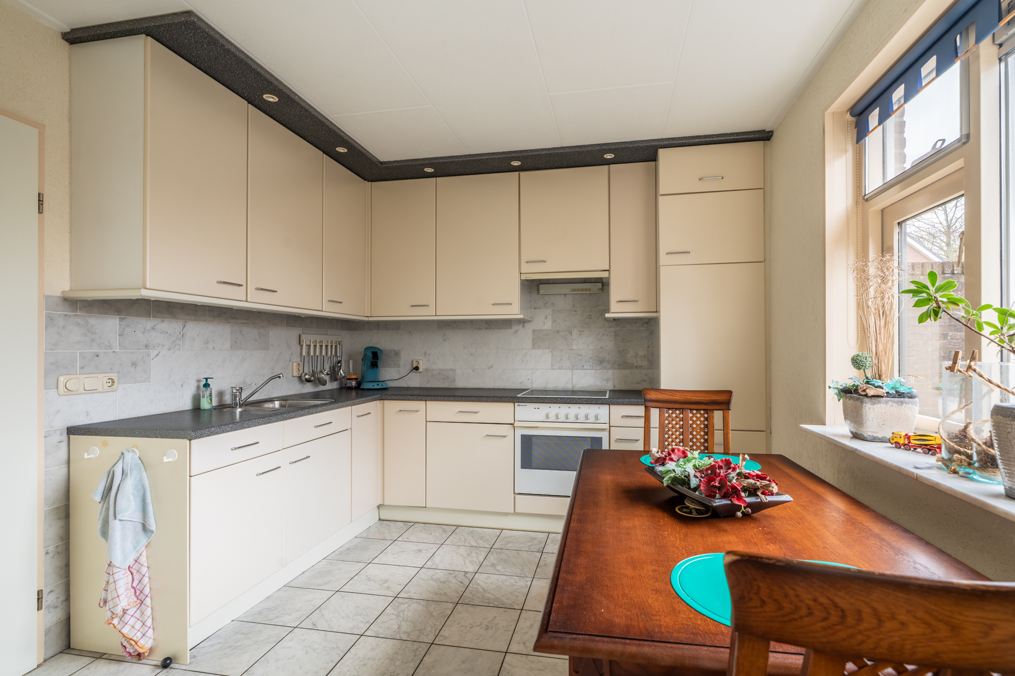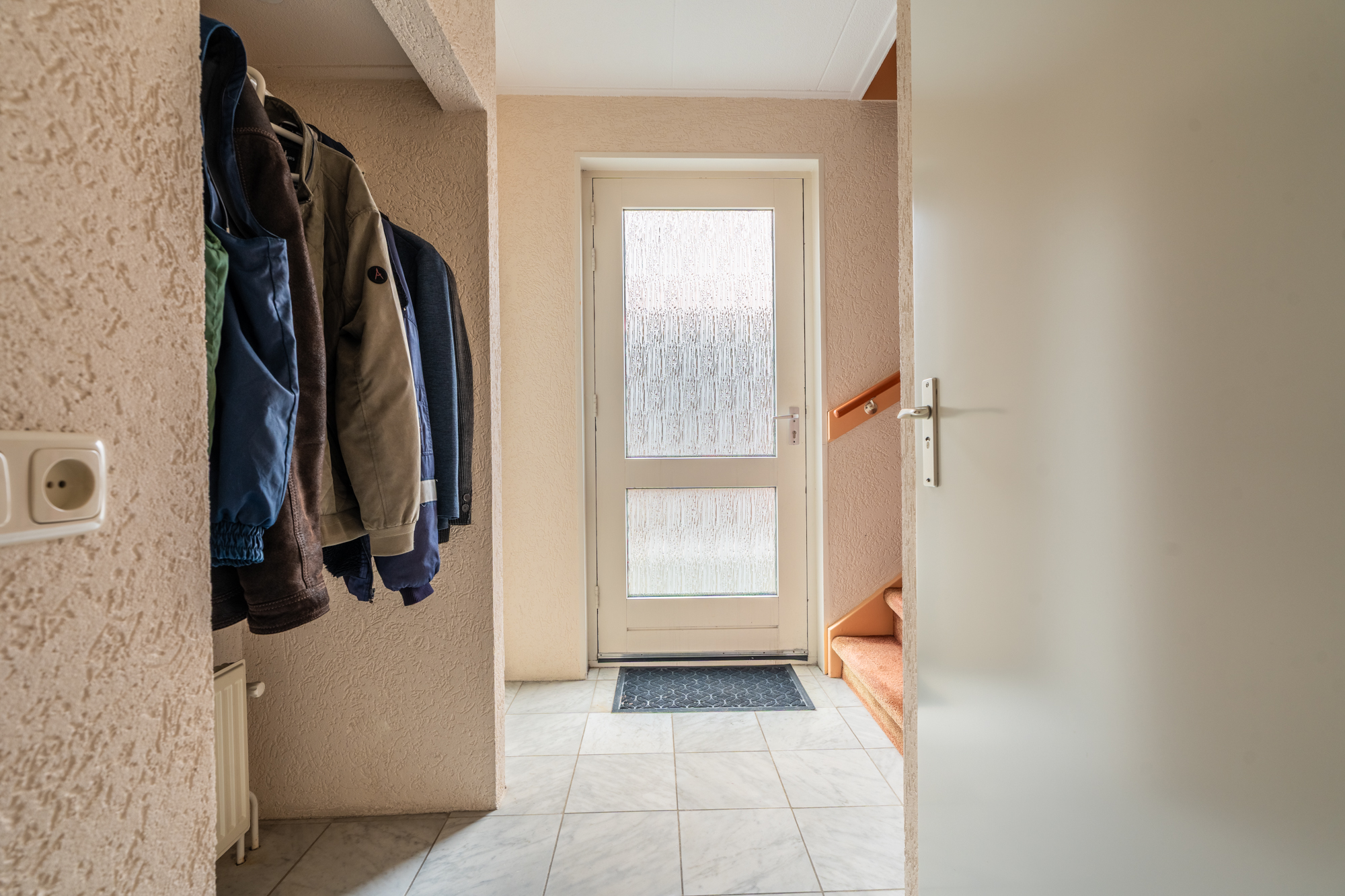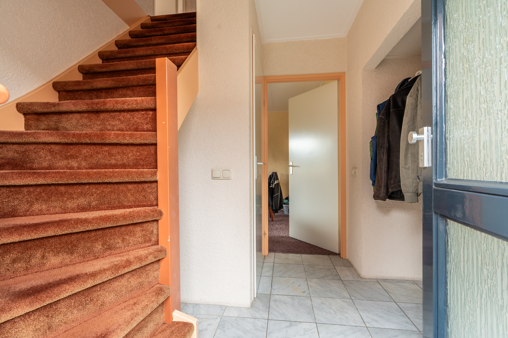 Begane grond: hal met zij-entree, meterkast en trapopgang; toiletruimte met wandcloset en fonteintje; L-vormige woonkamer (ca. 27m²); woonkeuken (ca. 10.5m²) met een inbouwkeuken in hoekopstelling v.v. diverse apparatuur (o.a. elektrisch fornuis met oven, afzuigkap, koelkast en vaatwasser); bijkeuken met achter-entree, witgoedaansluitingen en vaste kast.