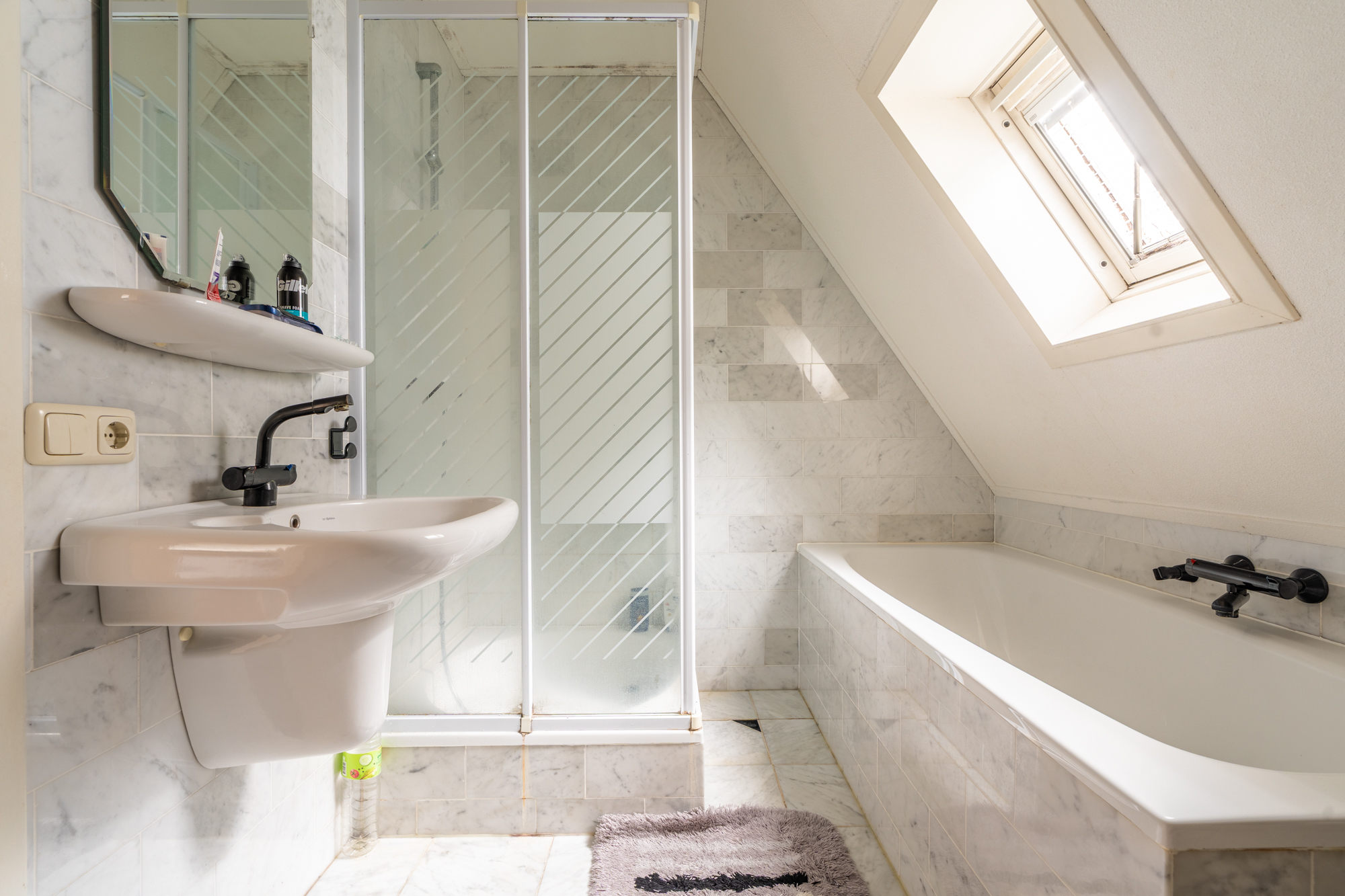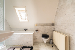 Verdieping: overloop; 3 slaapkamers (ca. 7.2m², 8.8m² en 14.5m²); badkamer met ligbad, douchecabine, wastafel en 2e toilet (wandcloset).