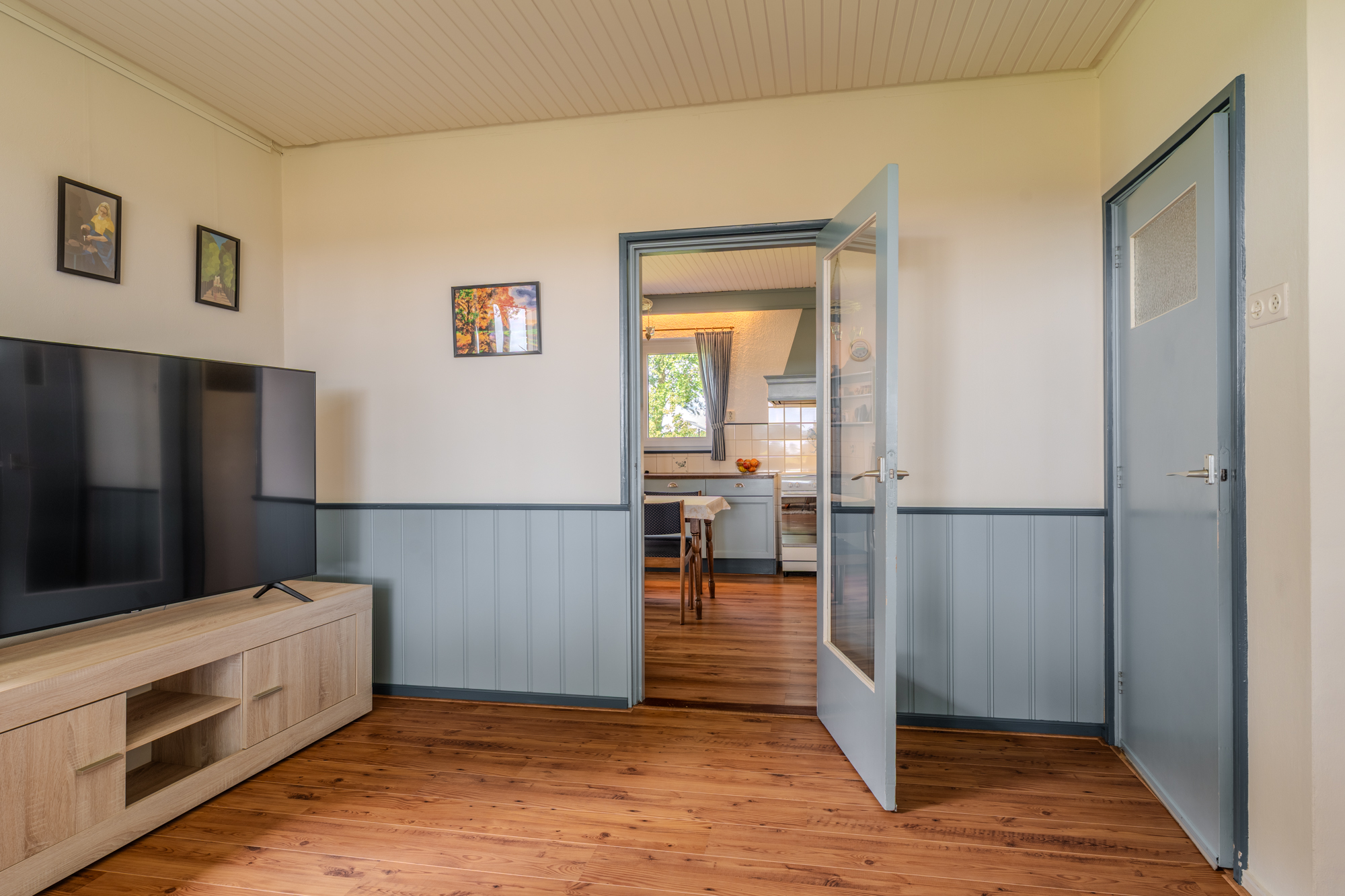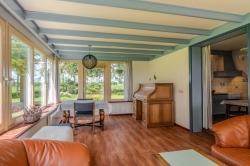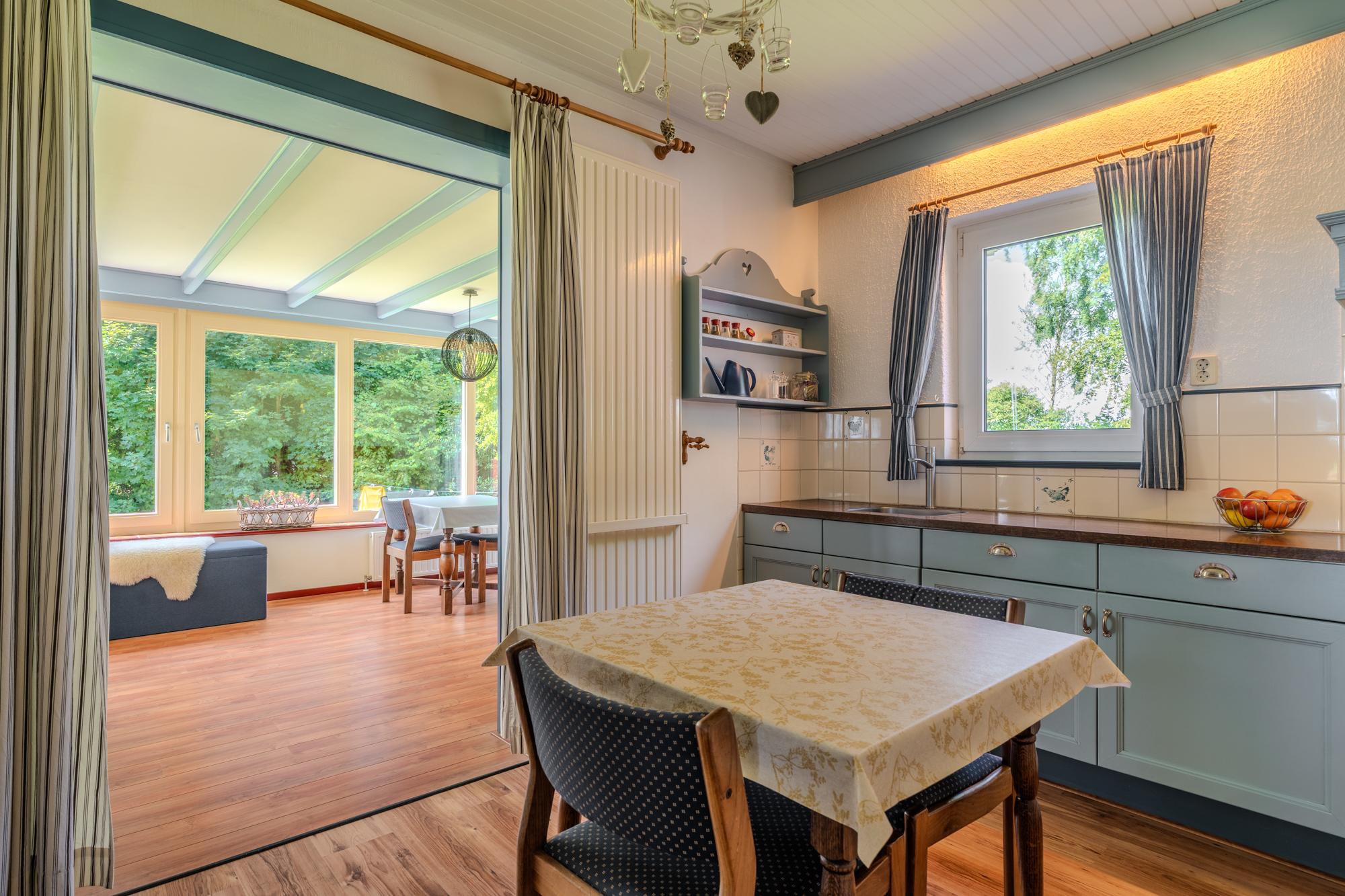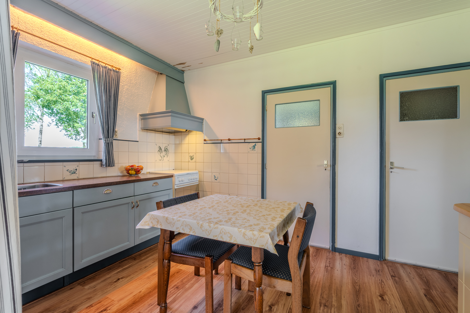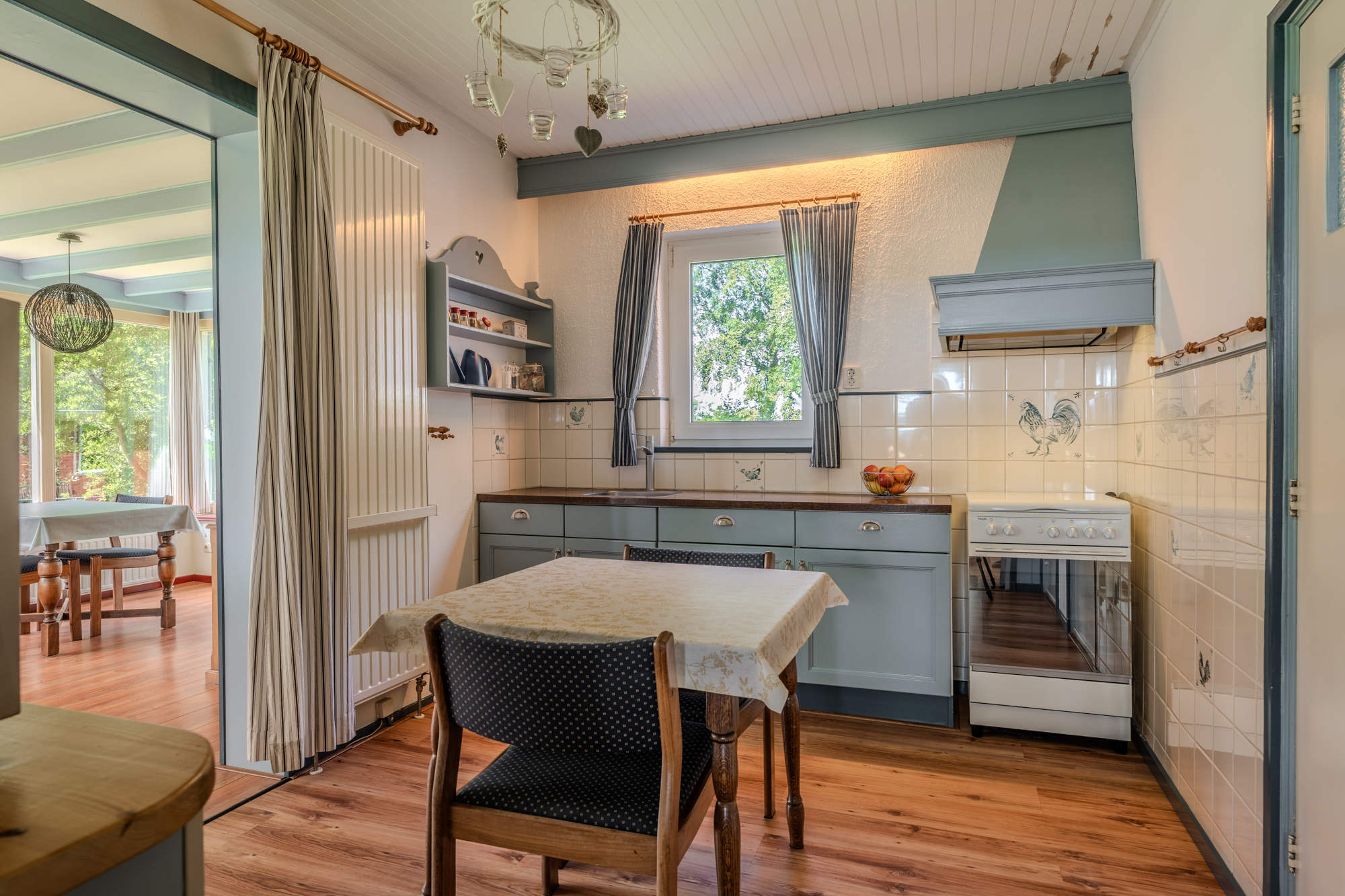 Indeling: hal met zij-entree en trapopgang; woonkamer (ca. 24.8m²) met fraai uitzicht op tegenover gelegen landerijen en een houtkachel; woonkeuken (ca. 11m²) v.v. inbouwkeuken met enige (losse) apparatuur (o.a. gasfornuis, afzuigkap en koelkast) en doorgang naar een aangebouwde serre/eetkamer (ca. 21.7m²) met openslaande tuindeur en een prachtig uitzicht op de tuin en een weids uitzicht over zowel de voor- als achter gelegen landerijen; voorraadkast en kelder (hoogte ca. 1.85m); bijkeuken met achter-entree en witgoedaansluitingen; badkamer met douche en badmeubel v.v. wastafel; toiletruimte. Verdieping: overloop; 2 slaapkamers (ca. 10.8m² en 9.4m²) beide met vaste kastruimte, de slaapkamer aan de voorzijde heeft een inloopkast (ca. 2m²); berging. Verdieping boven de aanbouw: van buitenaf bereikbare bergzolder.