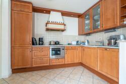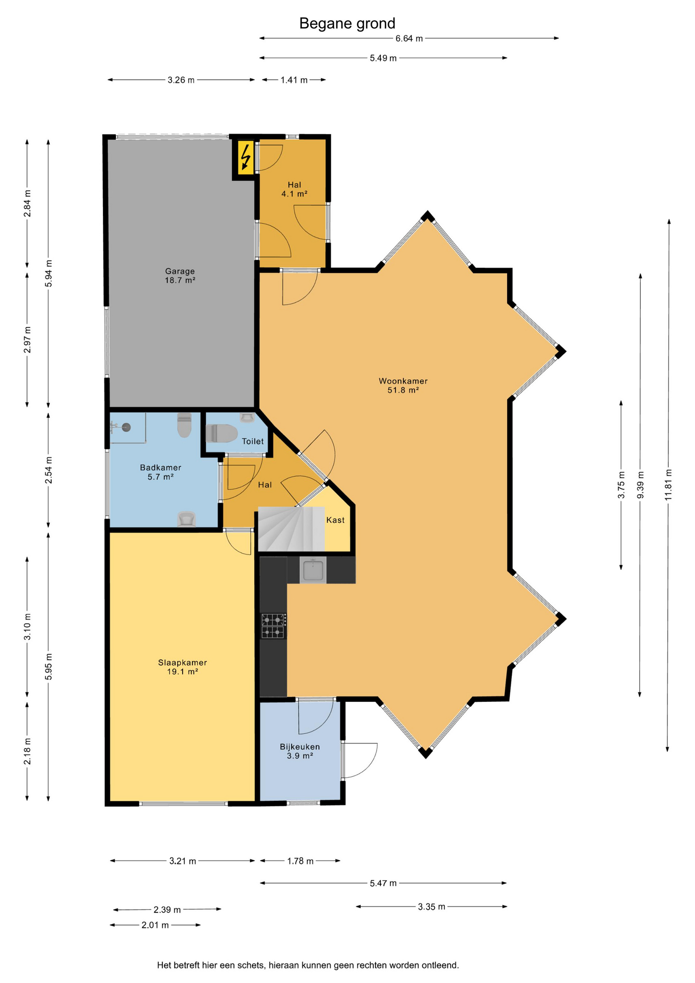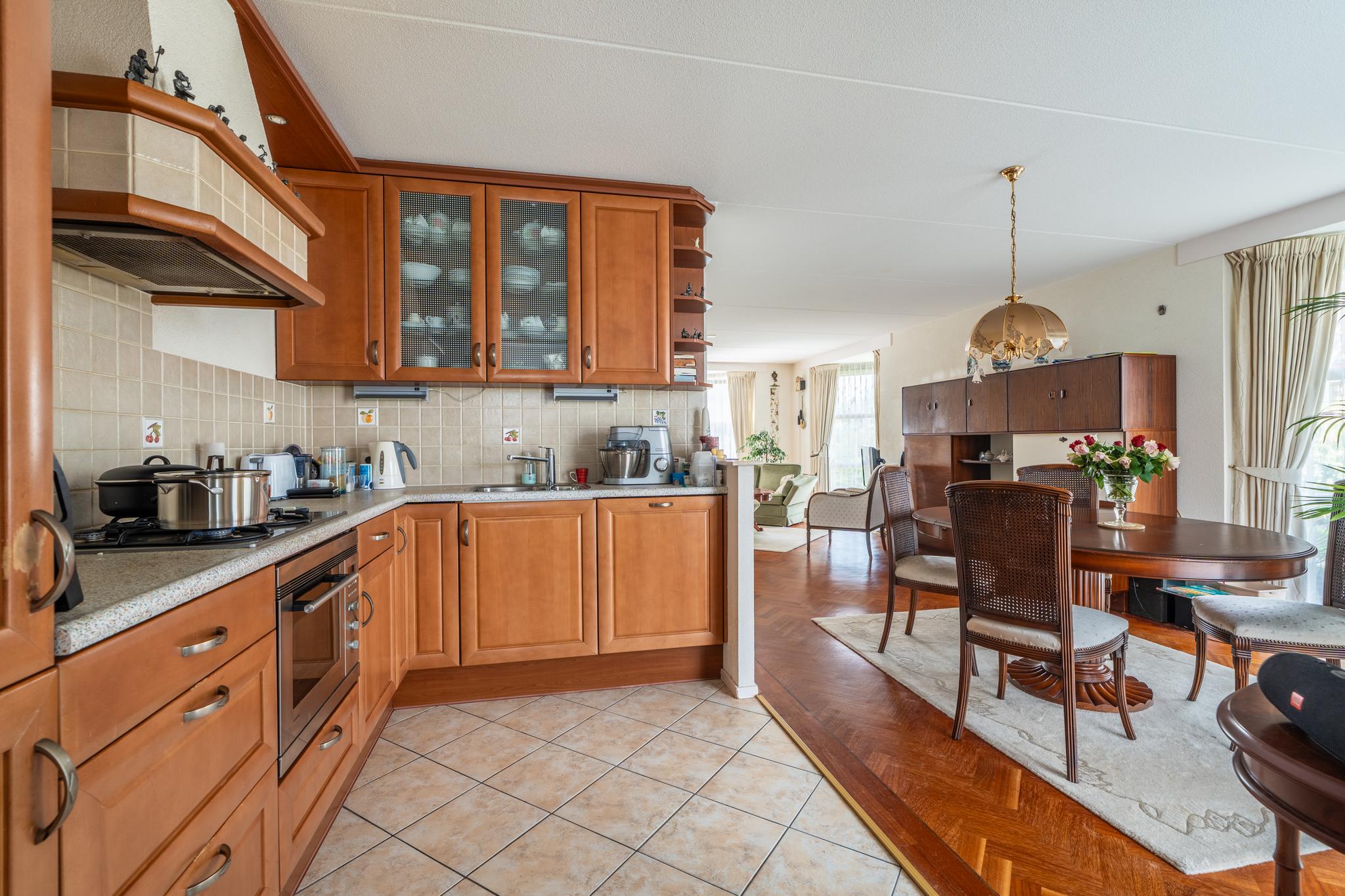 Begane grond: hal/entree met meterkast en doorgang naar de inpandige garage (ca. 19m²); zeer ruime woonkamer met open keuken en een 4-tal erkers (in totaal ca. 52m²) met een parketvloer en inbouwkeuken in hoekopstelling v.v. diverse apparatuur (gaskookplaat, afzuigkap, combi-magnetron, koelkast en vaatwasser); bijkeuken met witgoedaansluitingen en achter-entree; tussenhal met trapopgang en trapkast; toiletruimte met wandcloset en fonteintje; badkamer met douchecabine, wastafel en 2e toilet (wandcloset).