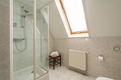 Verdieping: ruime overloop; 2 slaapkamers (ca. 14.7m² en 13.3m²); 2e badkamer met douchecabine, wastafel en toilet (wandcloset).