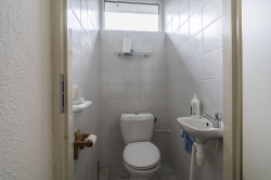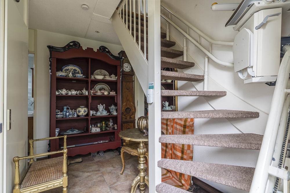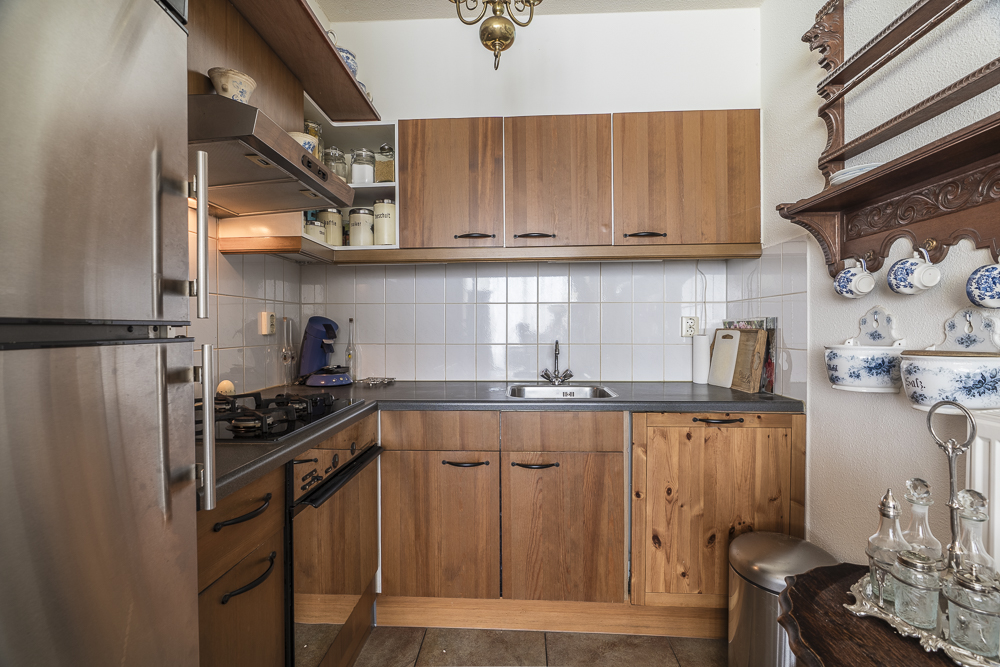 Indeling: hal met zij-entree, garderobe en trapopgang; bijkeuken / berging met witgoedaansluitingen, CV-opstelling en achter-entree; toiletruimte met fonteintje; tuingerichte woonkamer met openslaande terrasdeuren en open keuken (in totaal ca. 26.7m²) v.v. inbouwkeuken in hoekopstelling met diverse apparatuur (o.a. gaskookplaat, afzuigkap, oven en vaatwasser); badkamer met ligbad, douchecabine en badmeubel met wastafel.