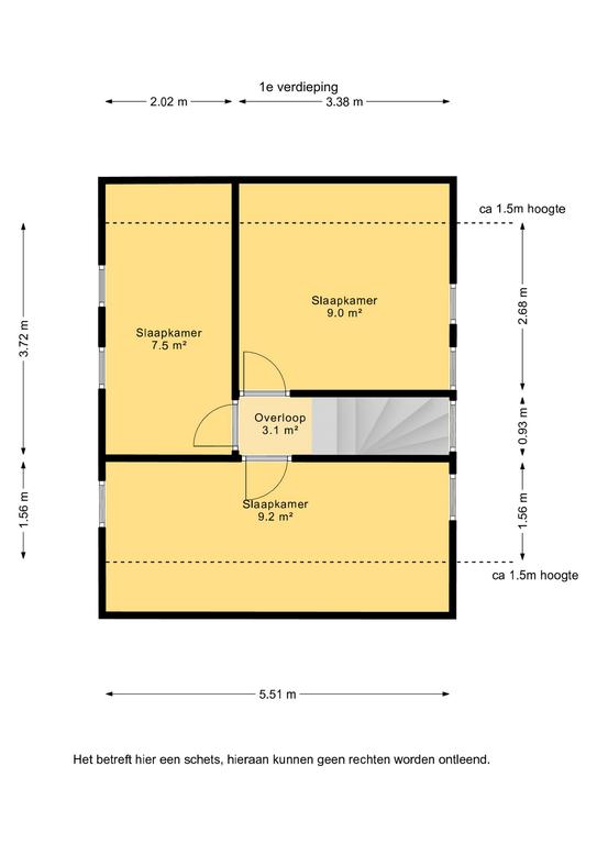 Verdieping: overloop; 3 slaapkamers (9.2m², 9m² en 7.5m²).