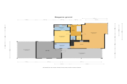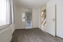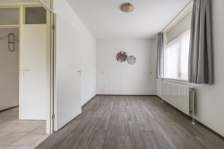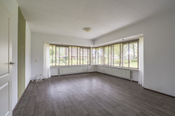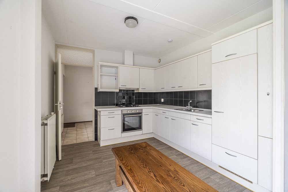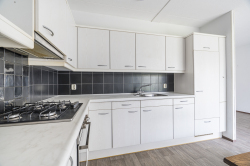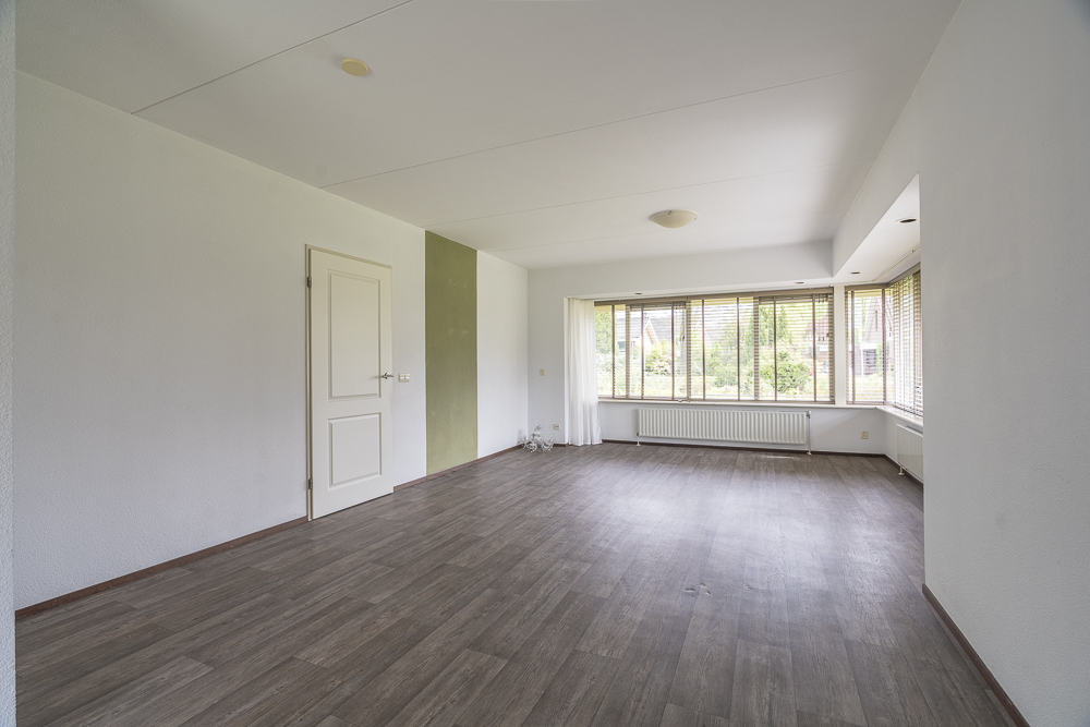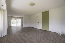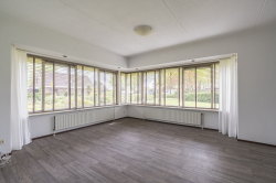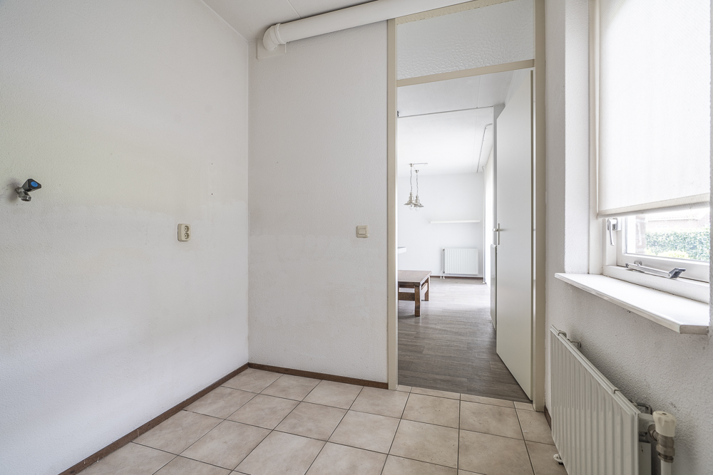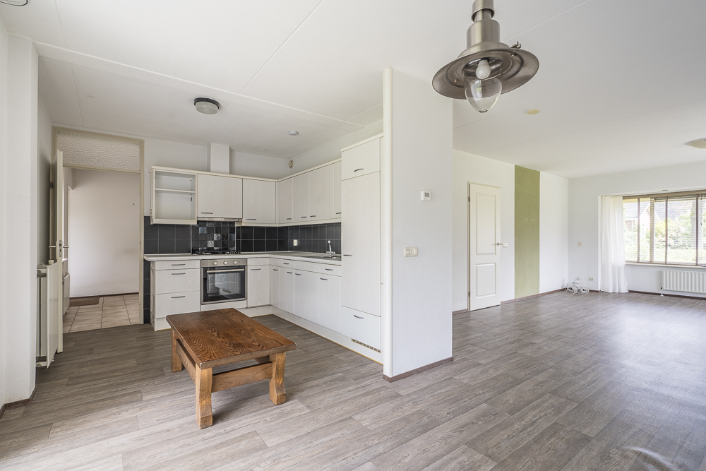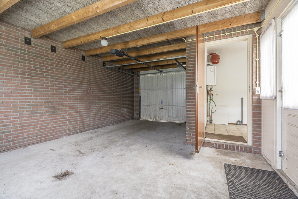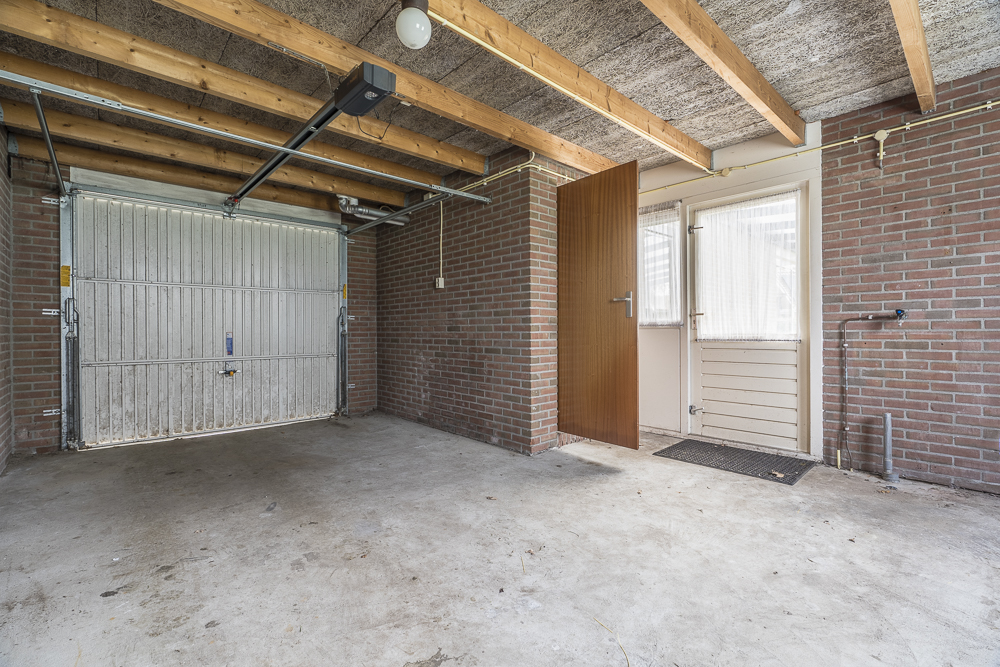 Indeling: hal / entree met trapopgang; toiletruimte; slaapkamer (ca. 12m²) met aansluitend een badkamer v.v. douche en wastafel; ruime woonkamer met open keuken (in totaal ca. 44m²) v.v. inbouwkeuken in hoekopstelling v.v. enige apparatuur (o.a. gaskookplaat, afzuigkap, oven, koelkast en vaatwasser) en een schuifpui naar de veranda; bijkeuken met witgoedaansluitingen en doorgang naar de aangebouwde garage (ca. 23m²) met een achter-entree.