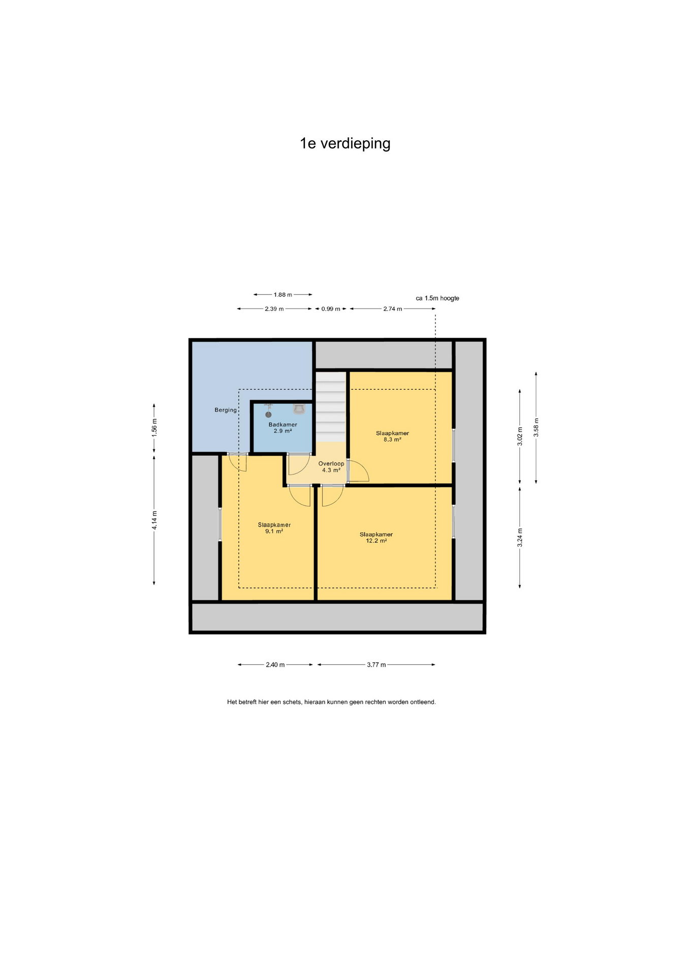 Verdieping: overloop; 2e badkamer met douche en wastafel; 3 slaapkamers (ca. 8.3m², 9.1m² en 12.2m²), bergruimte.