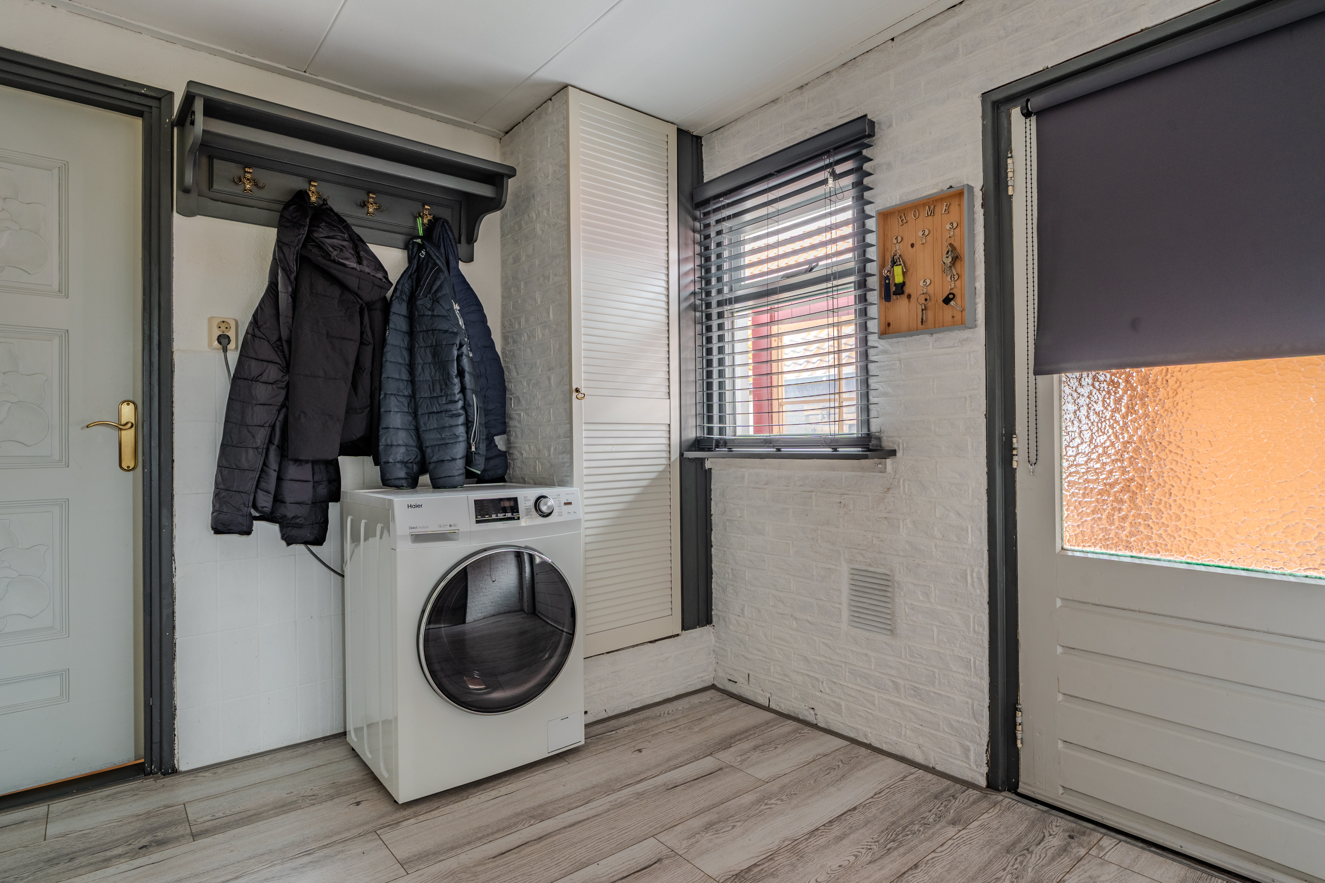 Indeling: aangebouwde hal-/achter-entree; centrale hal met witgoedaansluitingen en meterkast; badkamer met douche en wastafel; toiletruimte; 2 slaapkamers (ca. 7.6m² en 8.9m²); woonkeuken (ca. 14.5m²) met inbouwkeuken v.v. enige apparatuur (o.a. koelkast, combi-magnetron, vaatwasser, gaskookplaat en afzuigkap) en een ruime provisiekast; woonkamer (ca. 33m²) met laminaatvloer.