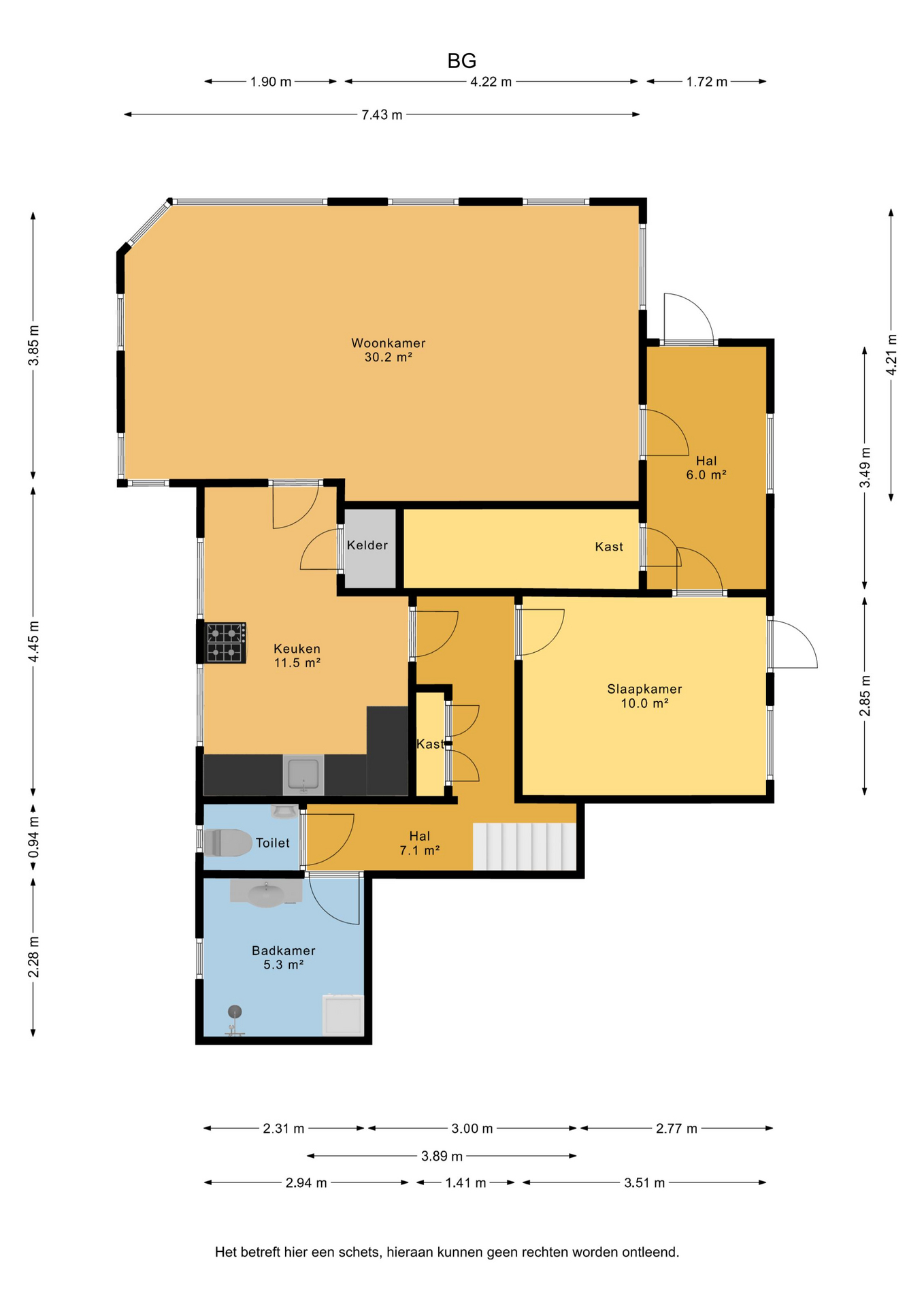 Indeling: hal / entree met een ruime inloopkast-/berging; woonkamer (ca. 30.2m²) met houtkachel en airco-unit; keuken (ca. 11.5m²) met een eenvoudige inbouwkeuken v.v. losse apparatuur; kelder; tussenhal met trapopgang; slaapkamer (ca. 10m²); badkamer met douchehoek, wastafelmeubel en witgoedaansluitingen; toiletruimte met wandcloset en fonteintje.