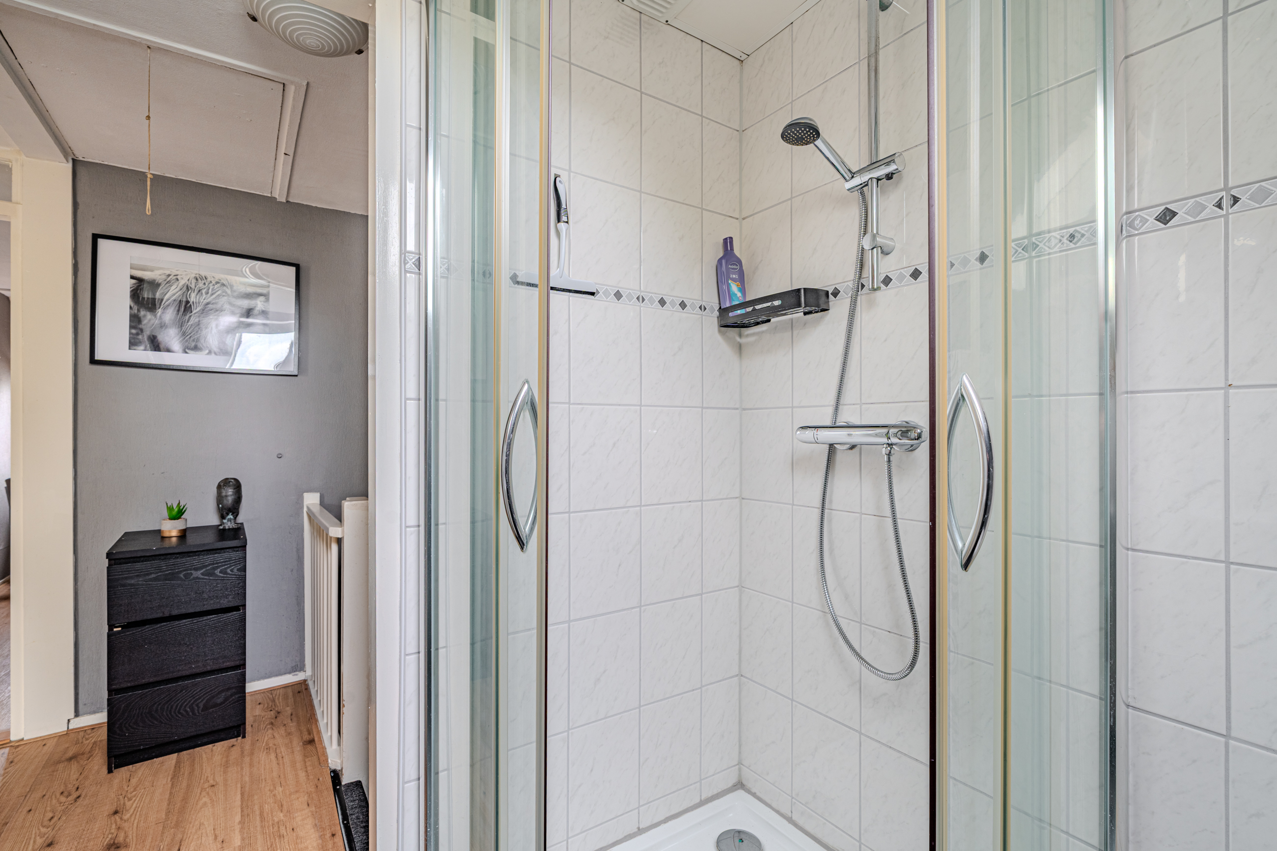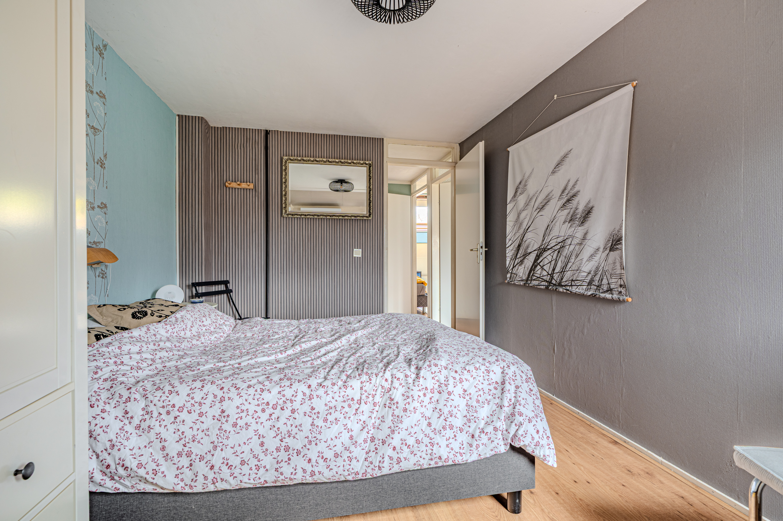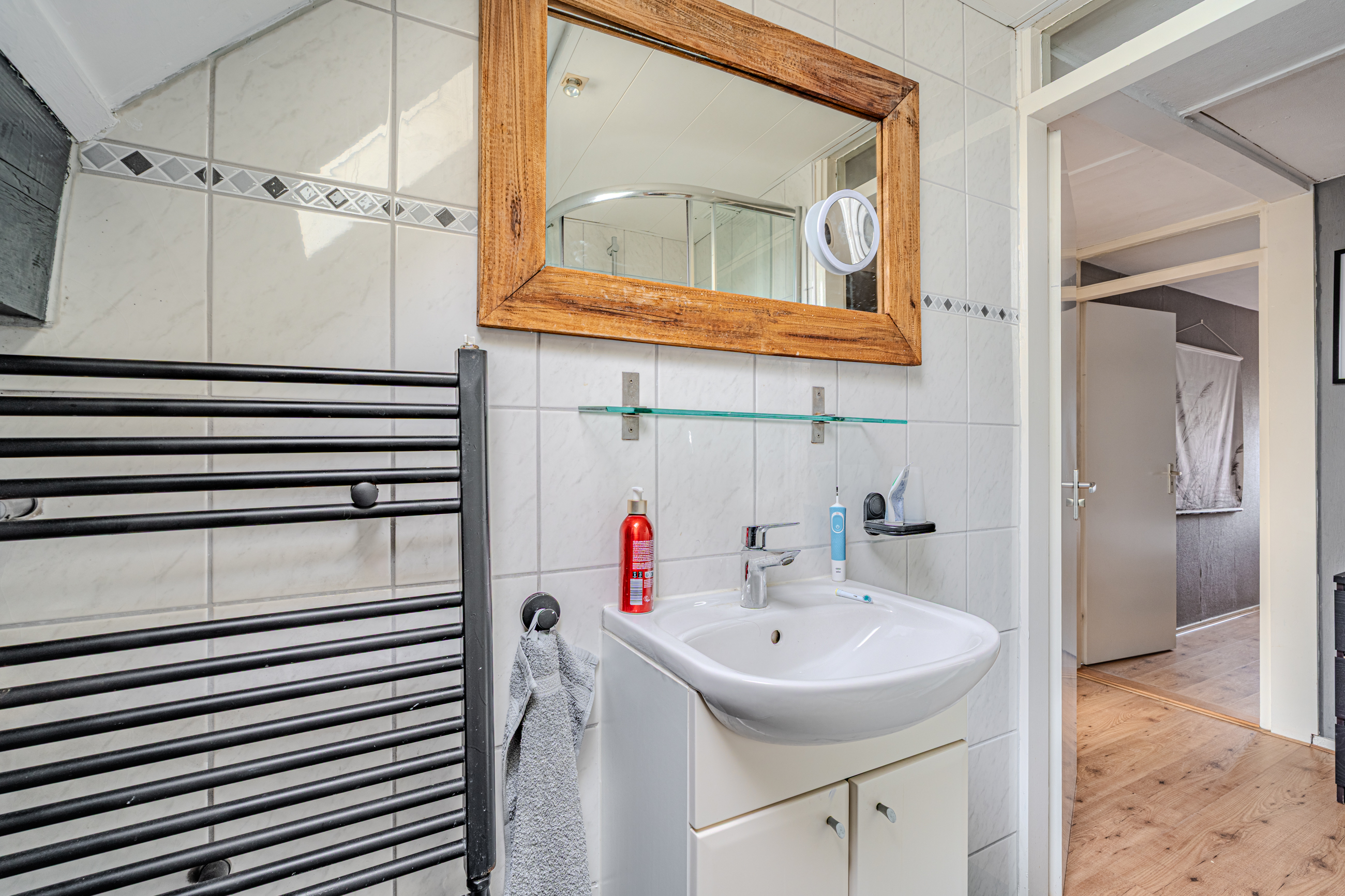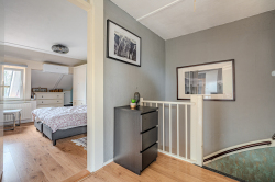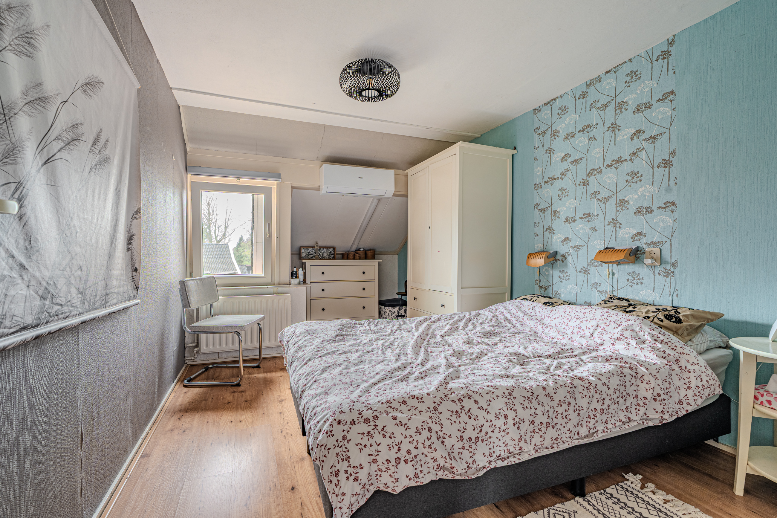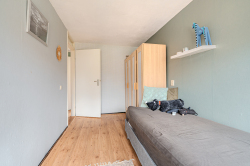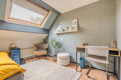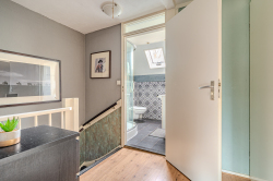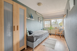 Verdieping: overloop; badkamer met douchecabine, badmeubel v.v. wastafel en 2e toilet (wandcloset); 3 slaapkamers (ca. 7.6m², 9.9m² en 11.8m²) waarvan de grootste is v.v. een airco-unit.