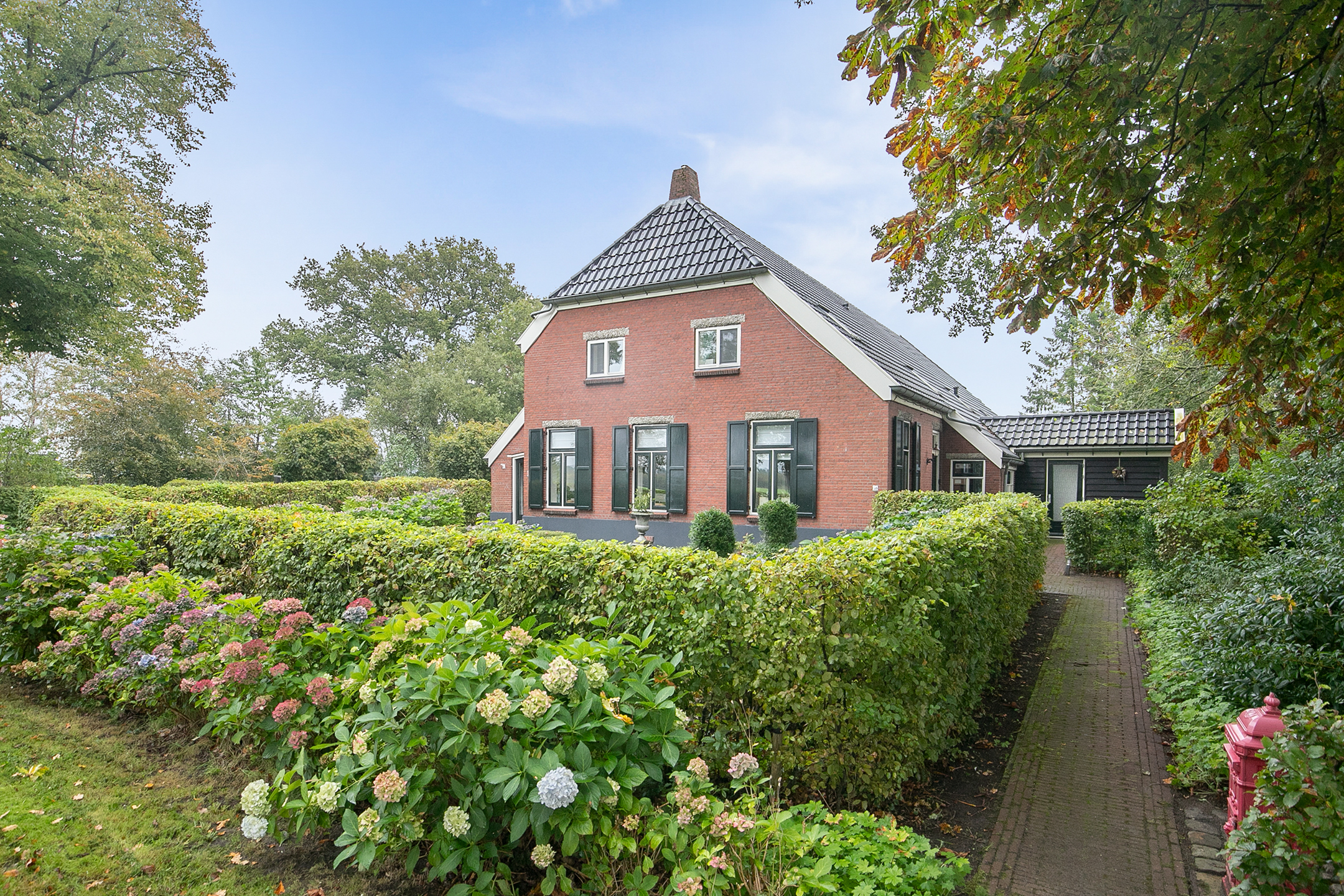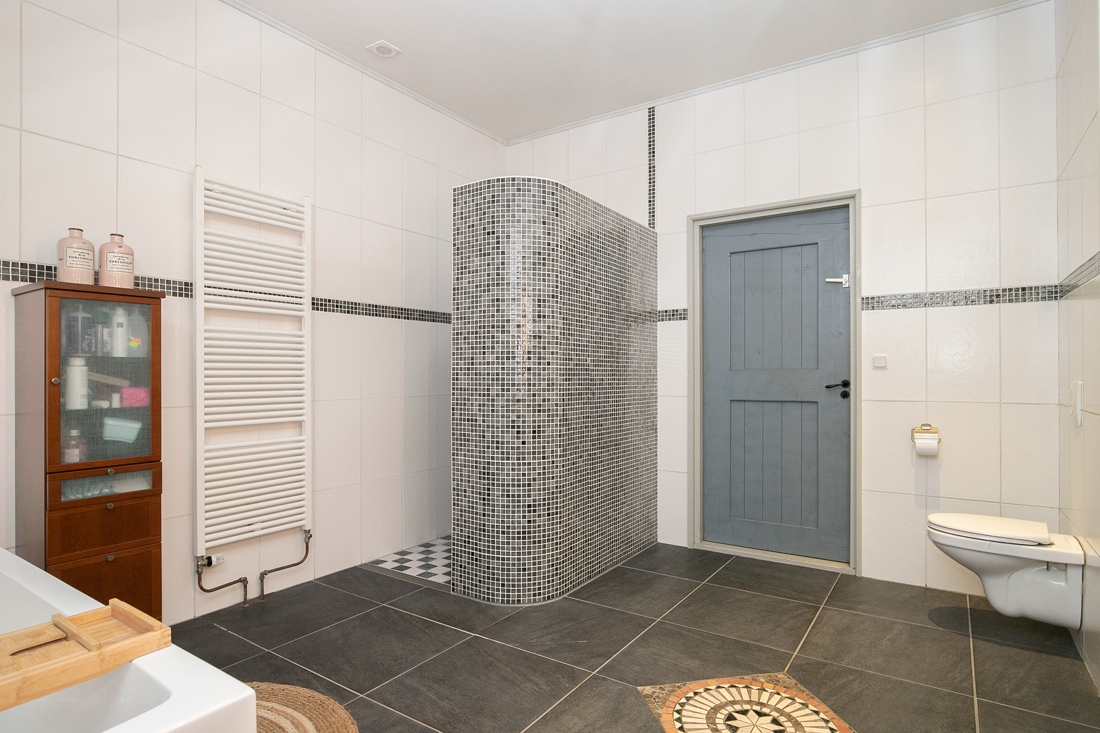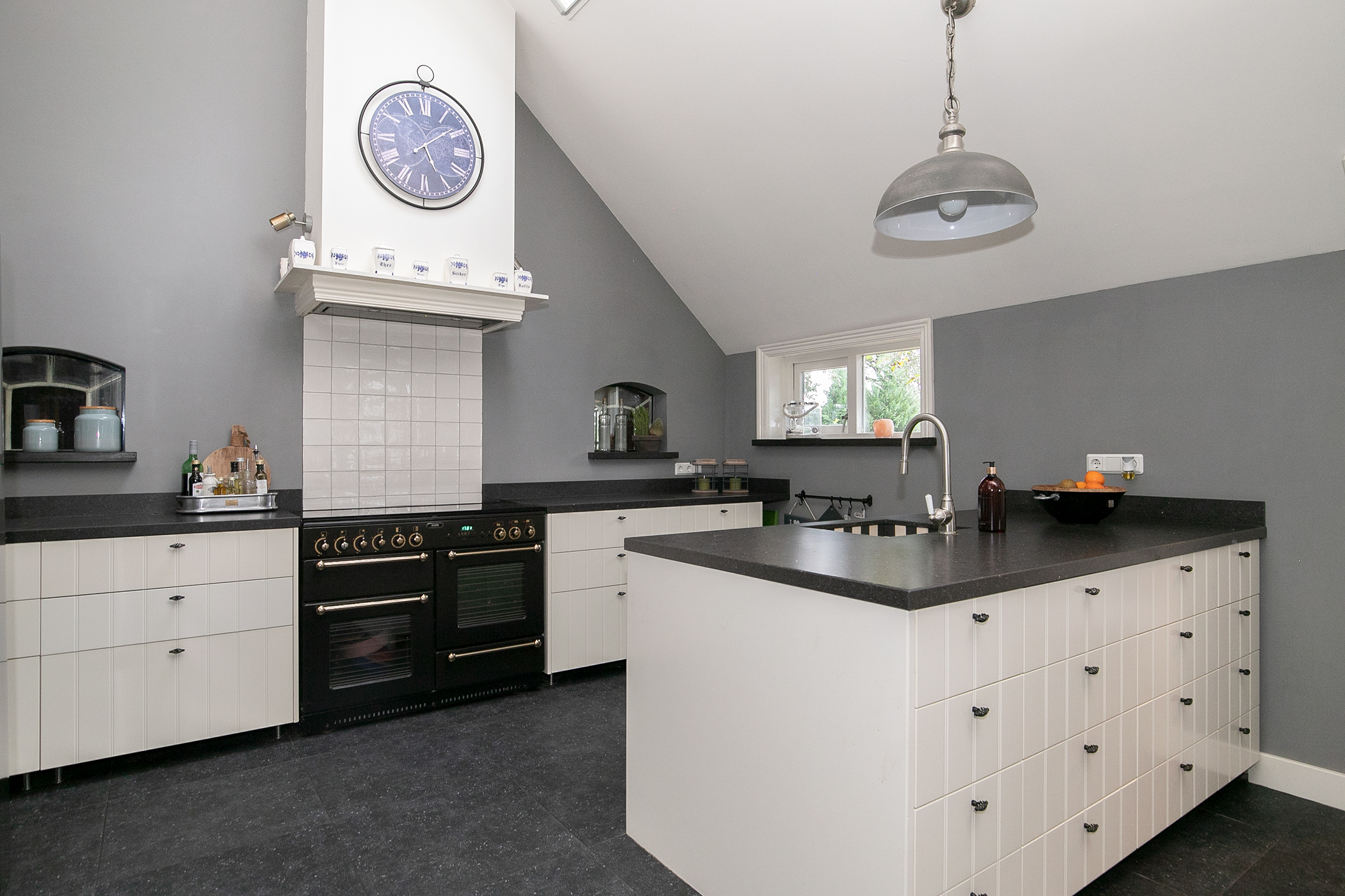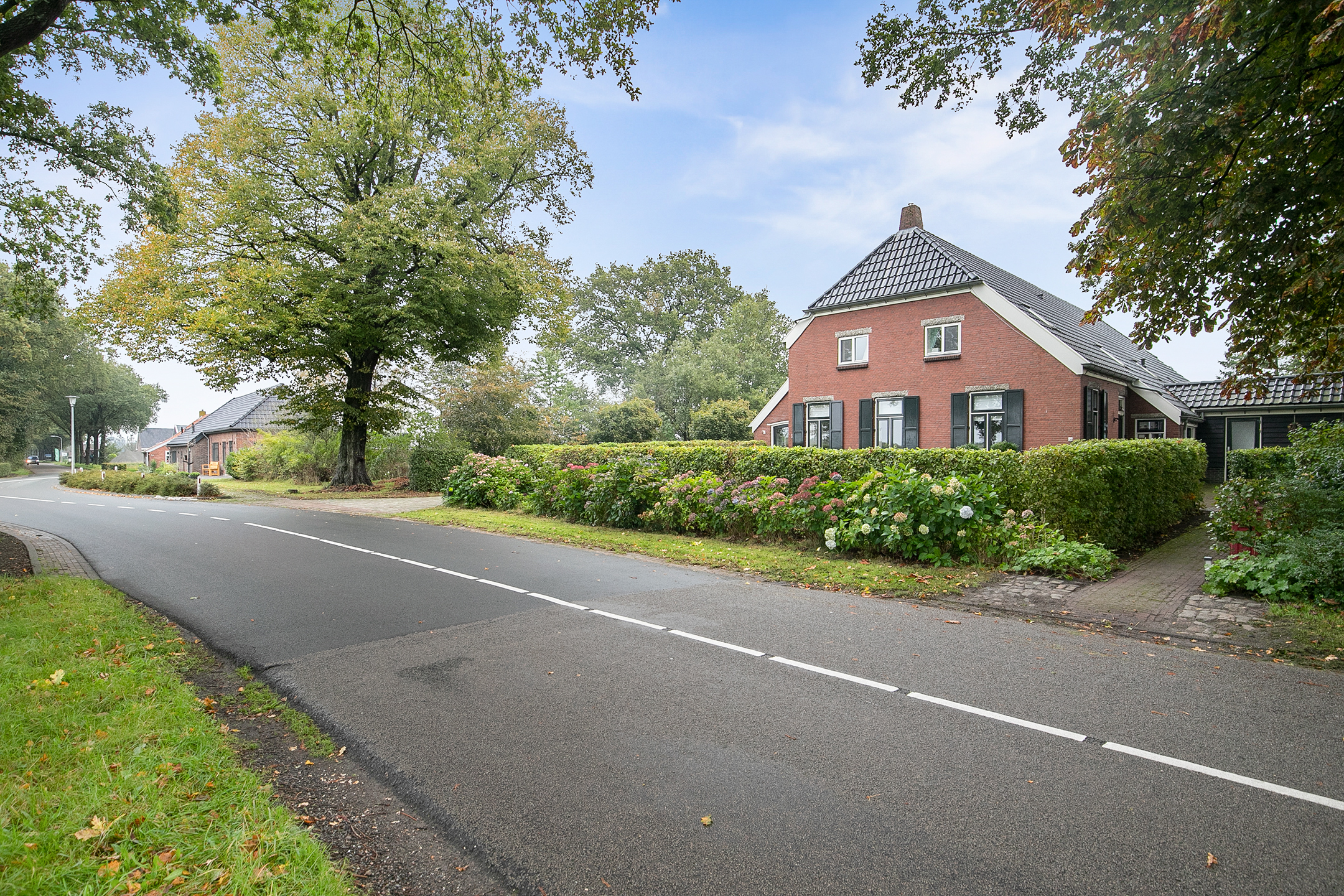Indeling: hal met zij-entree en meterkast; werk-/slaapkamer (ca. 15.1m²) met opgang naar een kelder; sfeervolle woonkamer (ca. 29.3m²) met balkenplafond en schouw v.v. pelletkachel; woonkeuken (ca. 32.3m²) met een prachtige lichtinval door de hooggeplaatste dakramen, provisiekast en een luxe inbouwkeuken v.v. spoeleiland, natuurstenen blad en diverse apparatuur (gasfornuis met 2 ovens, bakplaat en warmhoudplaat, afzuigkap in schouw, vaatwasser, combi-magnetron en koffieautomaat); bijkeuken (voormalig stookhuisje) met witgoedaansluitingen, 2e entree en een deur naar het terras; ruime centrale achterhal met een 2e keukenblok, trapopgang en doorgang naar de inpandige deel; toiletruimte met wandcloset en fonteintje; ouderslaapkamer (ca. 22.5m²) met een ruime inloop(kleding)kast (ca. 3.2m²) en doorgang naar de badkamer met een inloopdouche, badmeubel met wastafel, ligbad en toilet (wandcloset); inpandige deel-/schuurruimte (ca. 166m²) met een technische ruimte v.v. de CV opstelling en een extra witgoedaansluiting en 3 ruime paardenboxen.