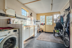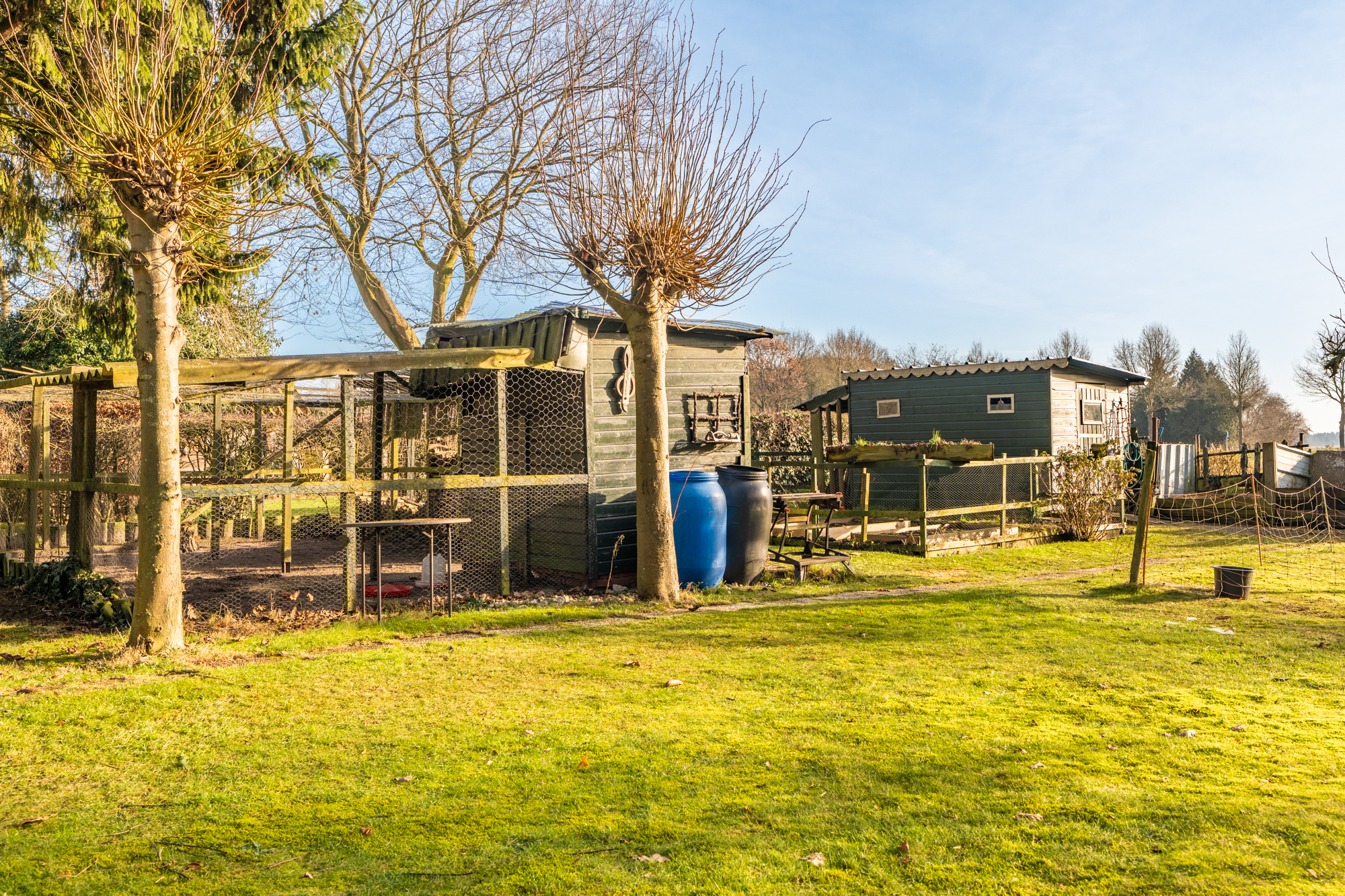 - achter in de tuin staat een houten schuur (ca. 8.4m²) en een kippenren-/hok.