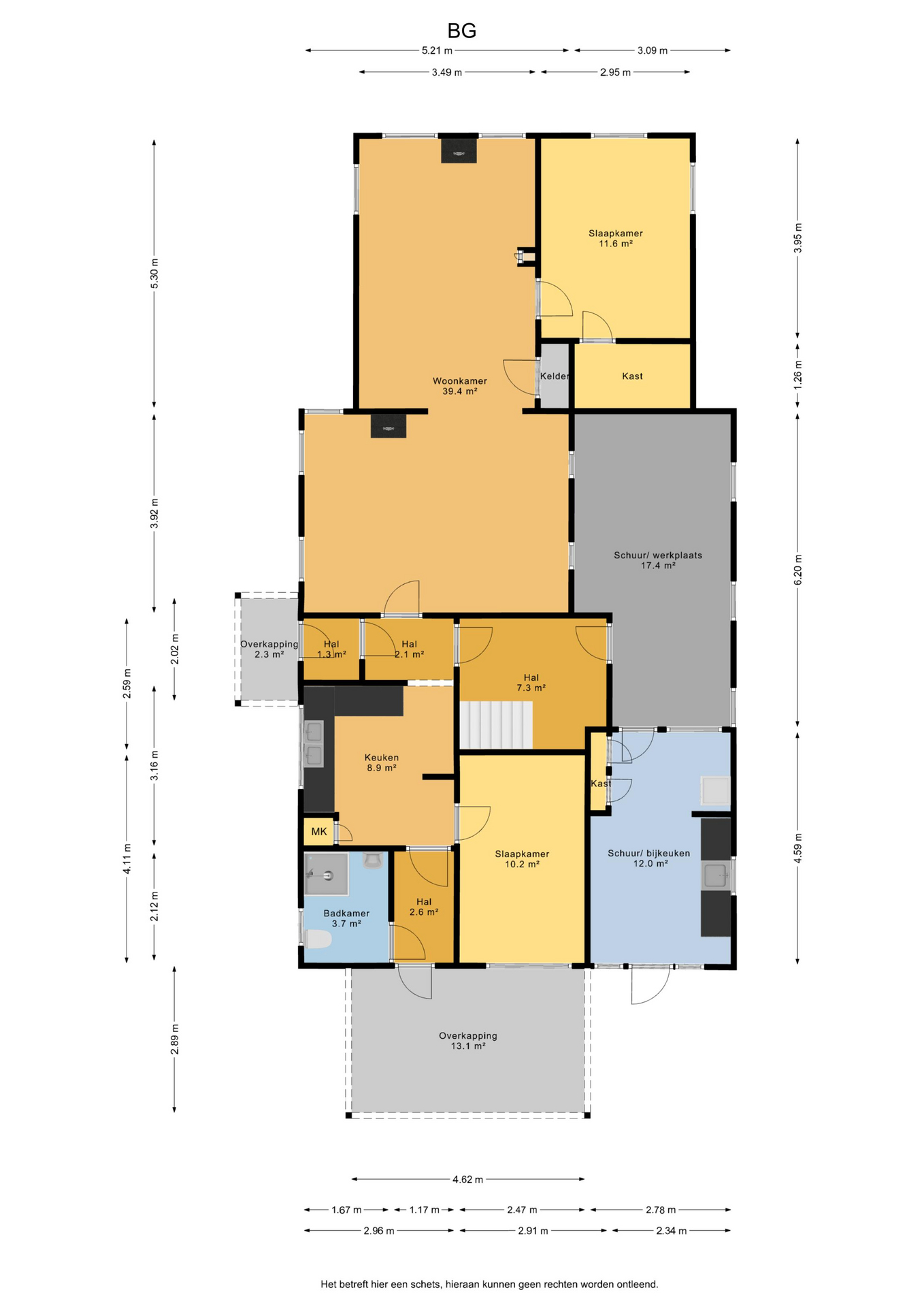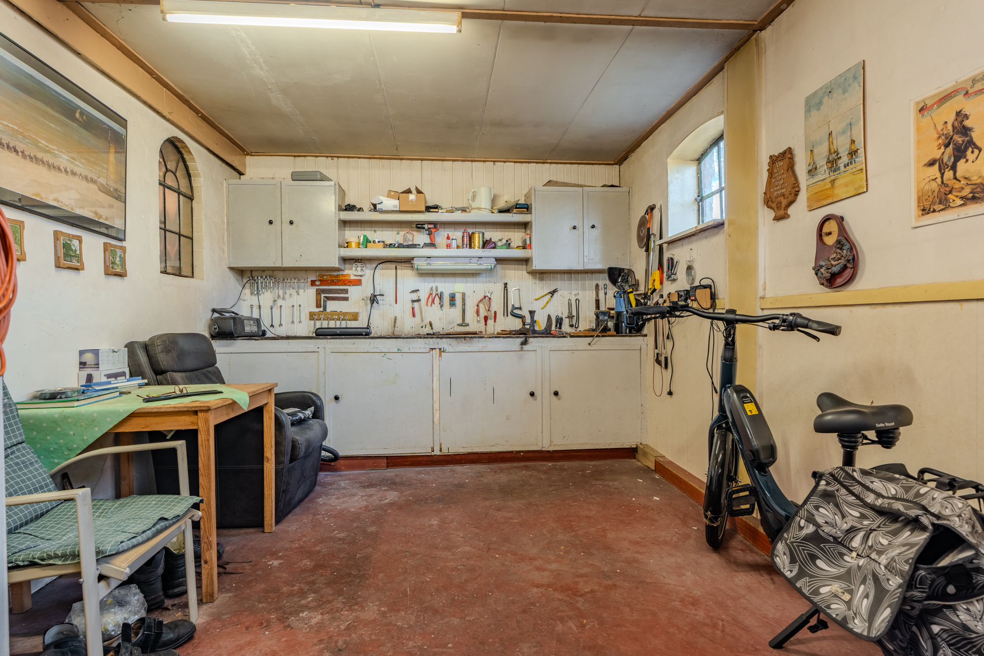 Begane grond: hal met zij-entree; woonkamer (ca. 39.4m²) met houtkachel; slaap-/werkkamer (ca. 11.6m²) met aansluitend een opkamertje; kelder; keuken (ca. 8.9m³) met inbouwkeuken in hoekopstelling v.v. enige apparatuur; slaapkamer (ca. 10.2m²); achterhal met achter-entree; badkamer met douchecabine, wastafel en toilet; tussenhal met trapopgang en doorgang naar de schuur-/werkplaats (ca. 17.4m²) met een houtkachel en schuurruimte-/bijkeuken met witgoedaansluitingen en 2e achter-entree.