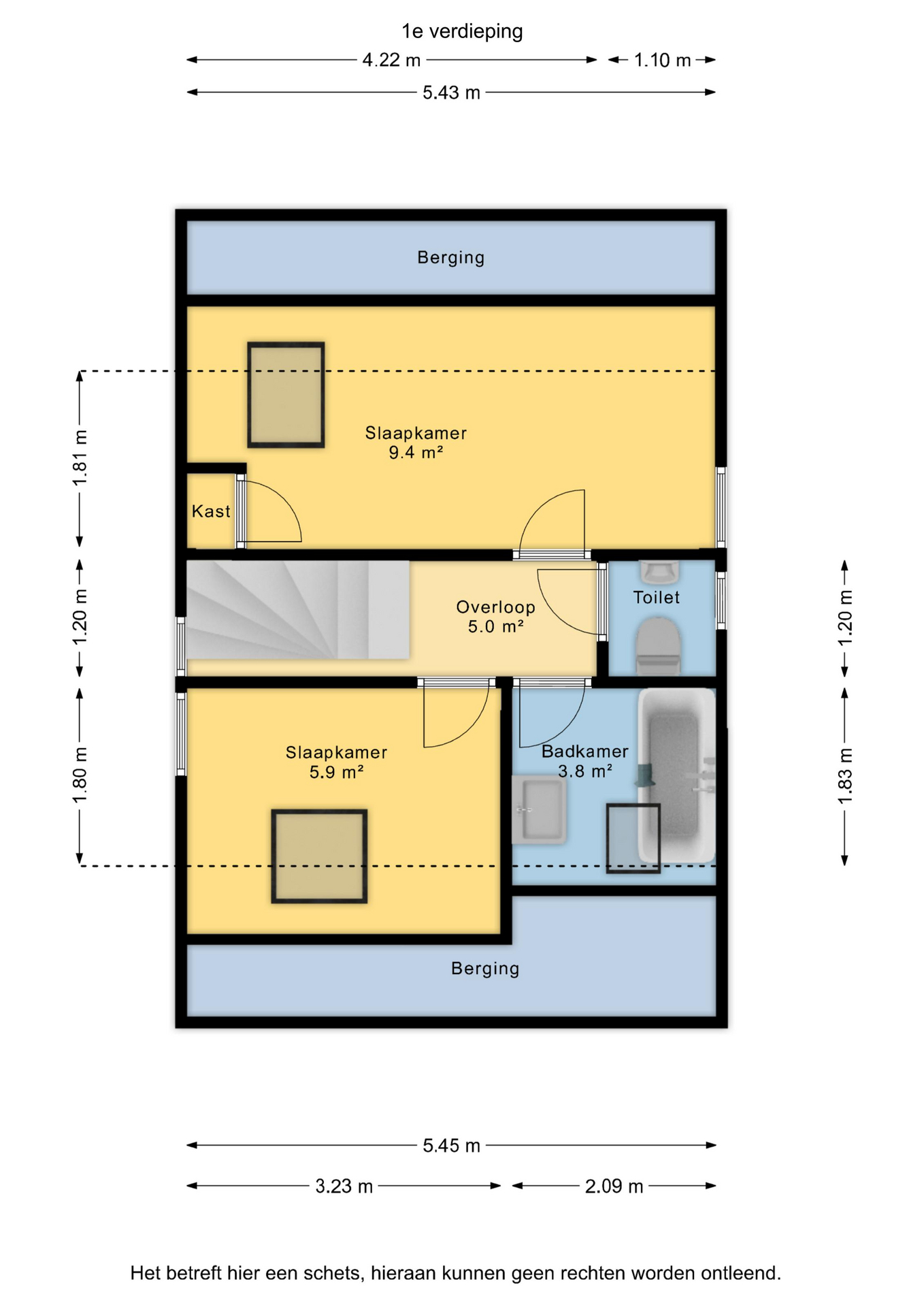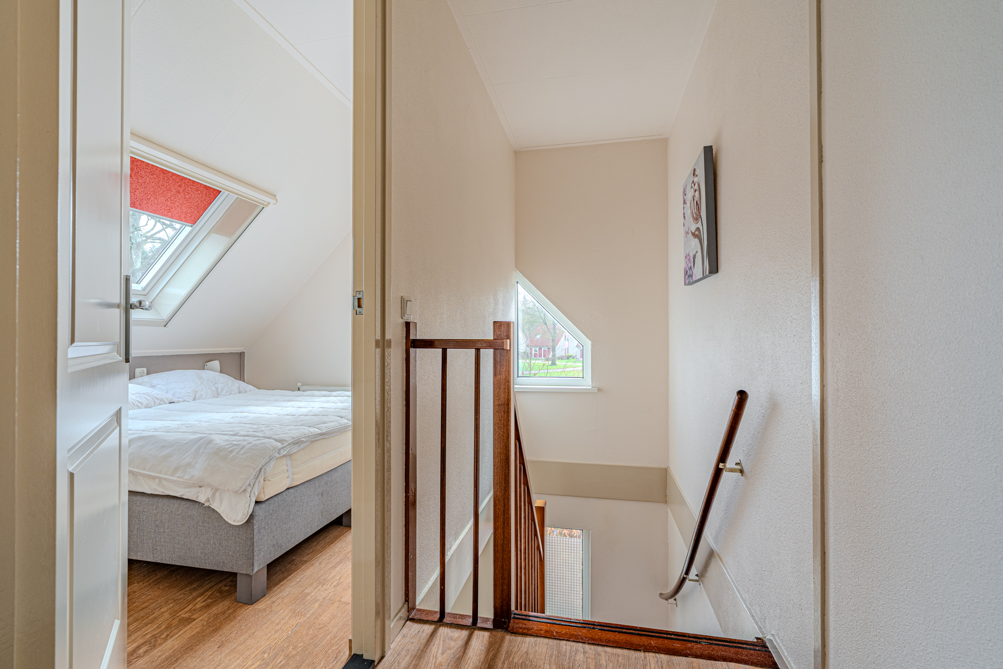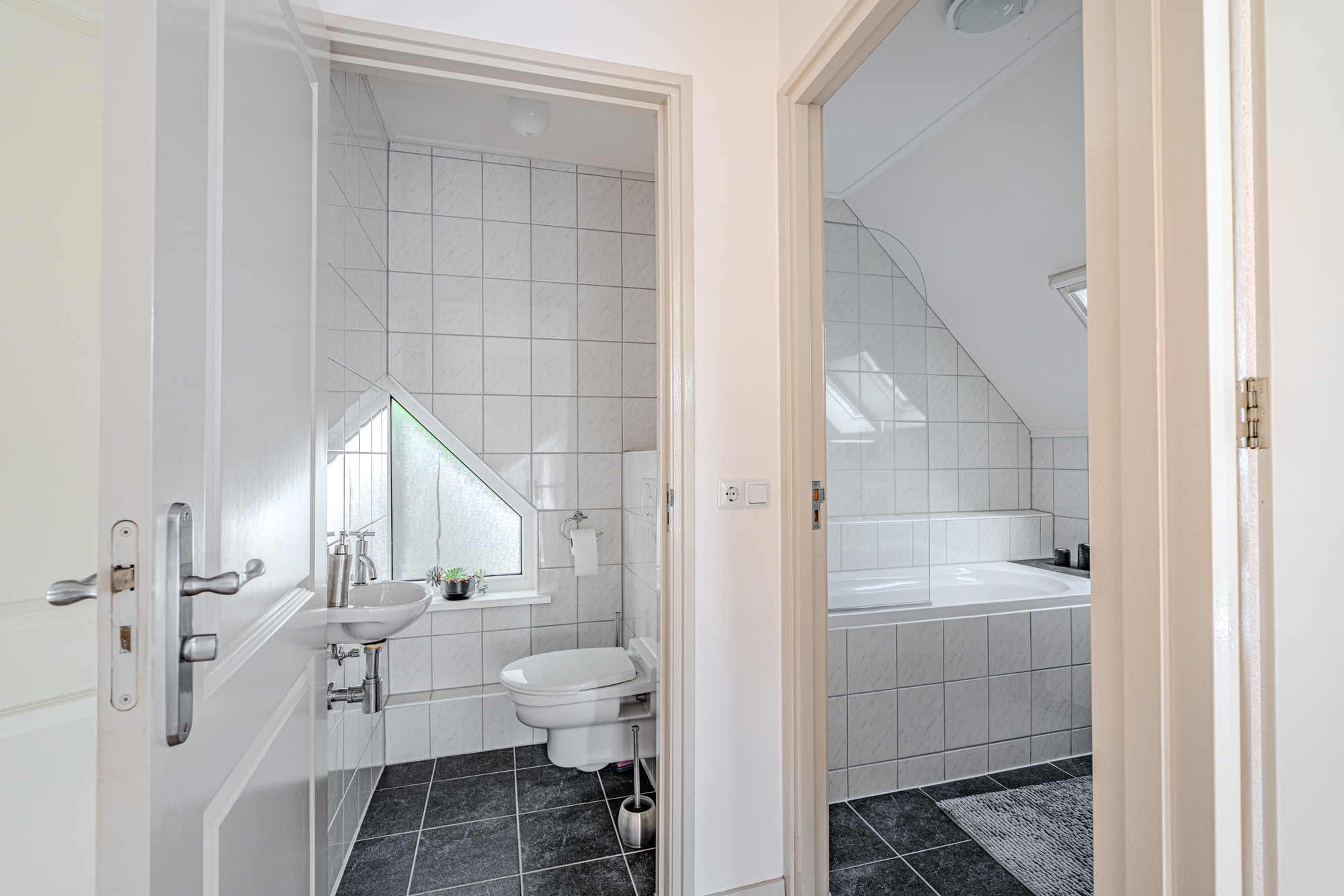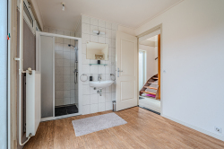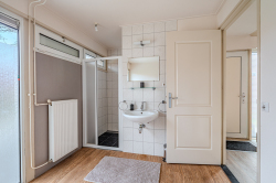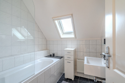1e verdieping: overloop, 2e toiletruimte, badkamer met wastafel en ligbad gecombineerd met douche, 2 slaapkamers (ca. 6m² en 10m²) v.v. extra kunststof dakramen.
