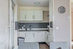 Indeling: hal/entree met trapopgang, toiletruimte met wandcloset en fonteintje, slaapkamer (ca. 8m²) met aansluitend een doucheruimte, tuingerichte woonkamer met tegelvloer en schuifpui naar de tuin, semi-open keuken v.v. inbouwkeuken in hoekopstelling met diverse apparatuur (o.a. met gaskookplaat, afzuigkap, magnetron, koelkast en vaatwasser), inpandige bijkeuken/berging met Cv-opstelling.